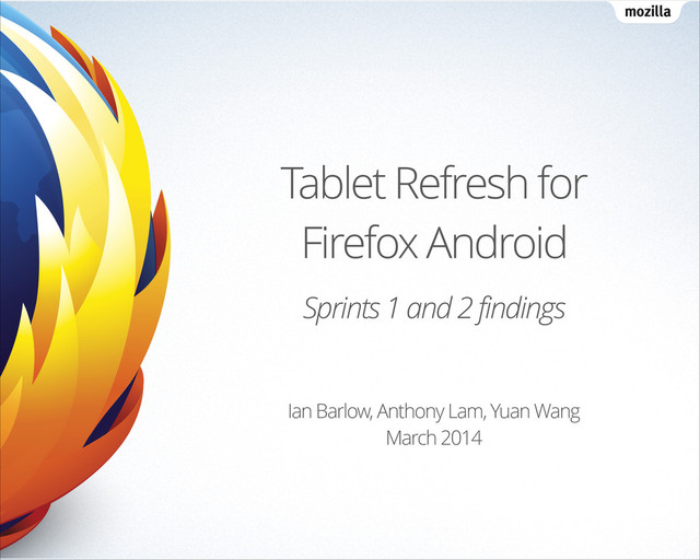 This is an ongoing project at Mozilla Firefox UX team. I am currently working on a redesign of Firefox for Android tablet with two other designers. This presentation is aimed to share findings from our first two design sprints with mobile engineering and ux team.