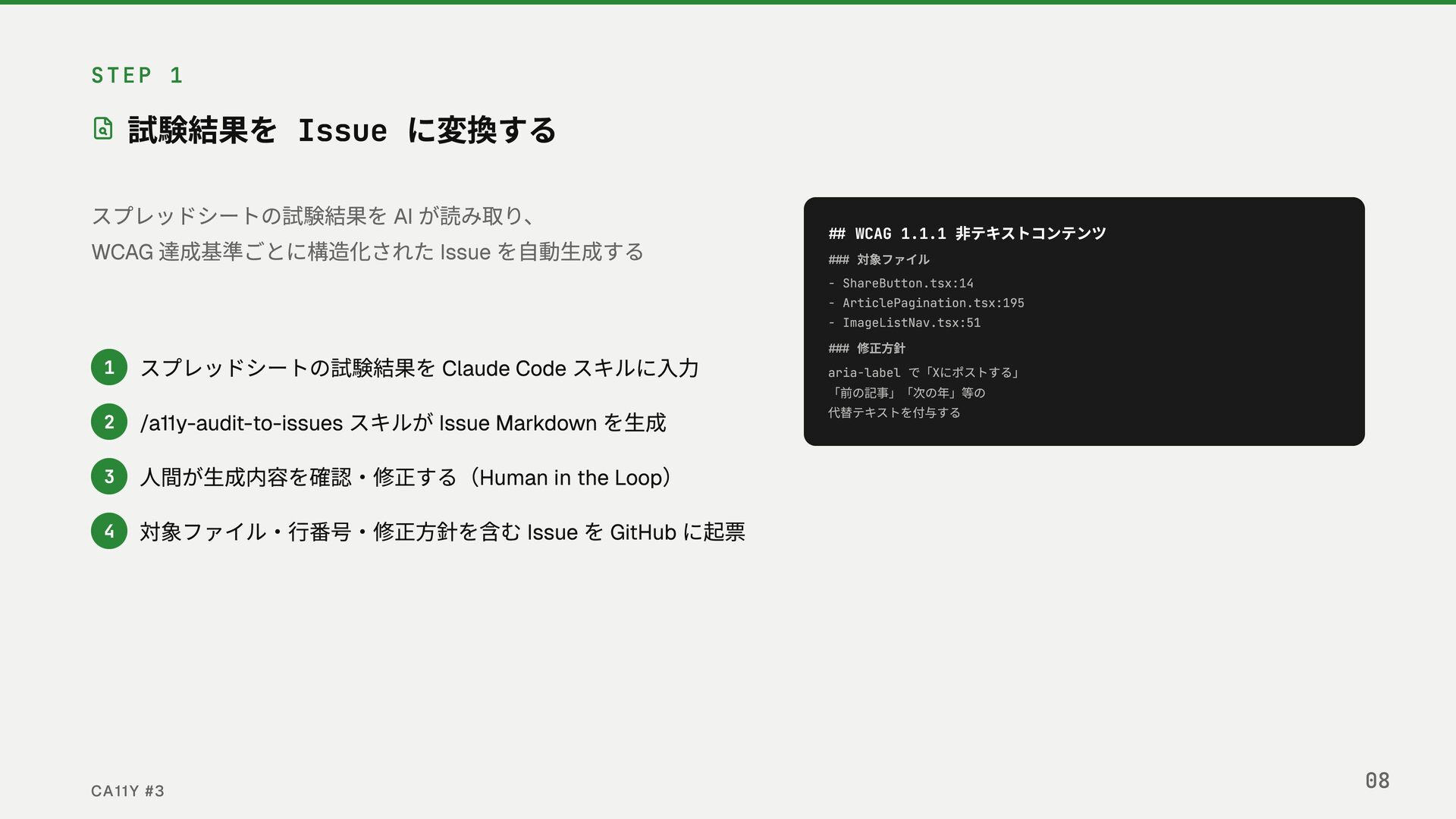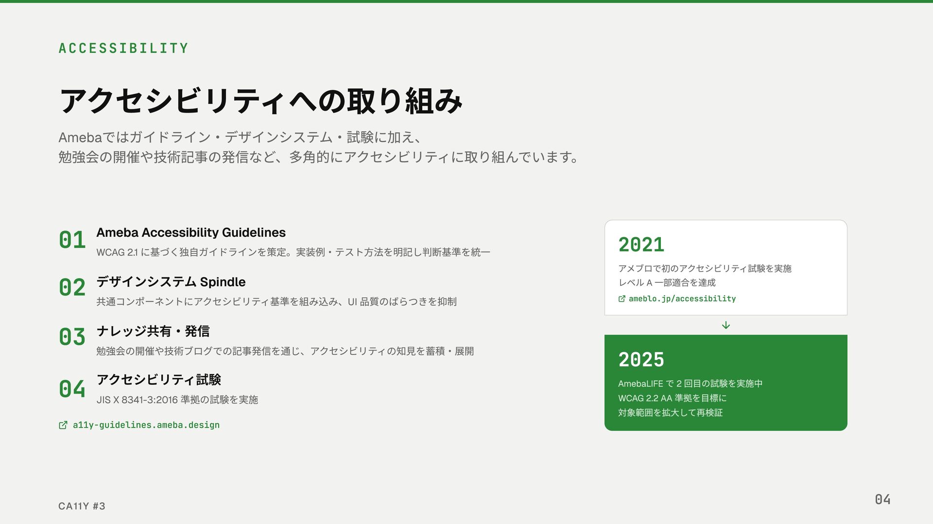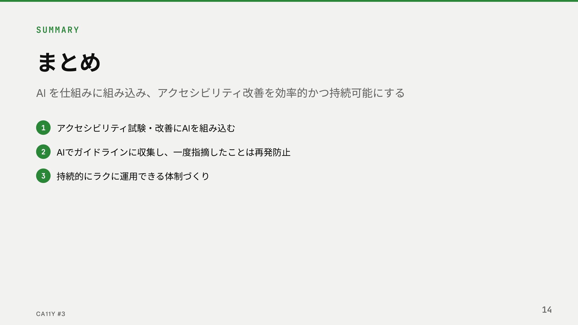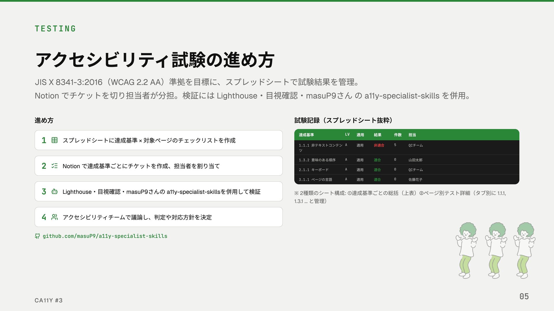でチケットを切り担当者が分担。検証にはLighthouse ‧⽬視確認‧masuP9 さんのa11y-specialist-skills を併⽤。 進め⽅ 1 スプレッドシートに達成基準 × 対象ページのチェックリストを作成 2 Notion で達成基準ごとにチケットを作成、担当者を割り当て 3 Lighthouse ‧⽬視確認‧masuP9 さんのa11y-specialist-skills を併⽤して検証 4 アクセシビリティチームで議論し、判定や対応⽅針を決定 github.com/masuP9/a11y-specialist-skills 試験記録(スプレッドシート抜粋) 達成基準 LV 適⽤ 結果 件数 担当 1.1.1 ⾮テキストコンテン ツ A 適⽤ ⾮適合 5 QCチーム 1.3.2 意味のある順序 A 適⽤ 適合 0 ⼭⽥太郎 2.1.1 キーボード A 適⽤ 適合 0 QCチーム 3.1.1 ページの⾔語 A 適⽤ 適合 0 佐藤花⼦ ※ 2 種類のシート構成: ① 達成基準ごとの総括(上表)② ページ別テスト詳細(タブ別に 1.1.1, 1.3.1 ... と管理) 05 CA11Y #3