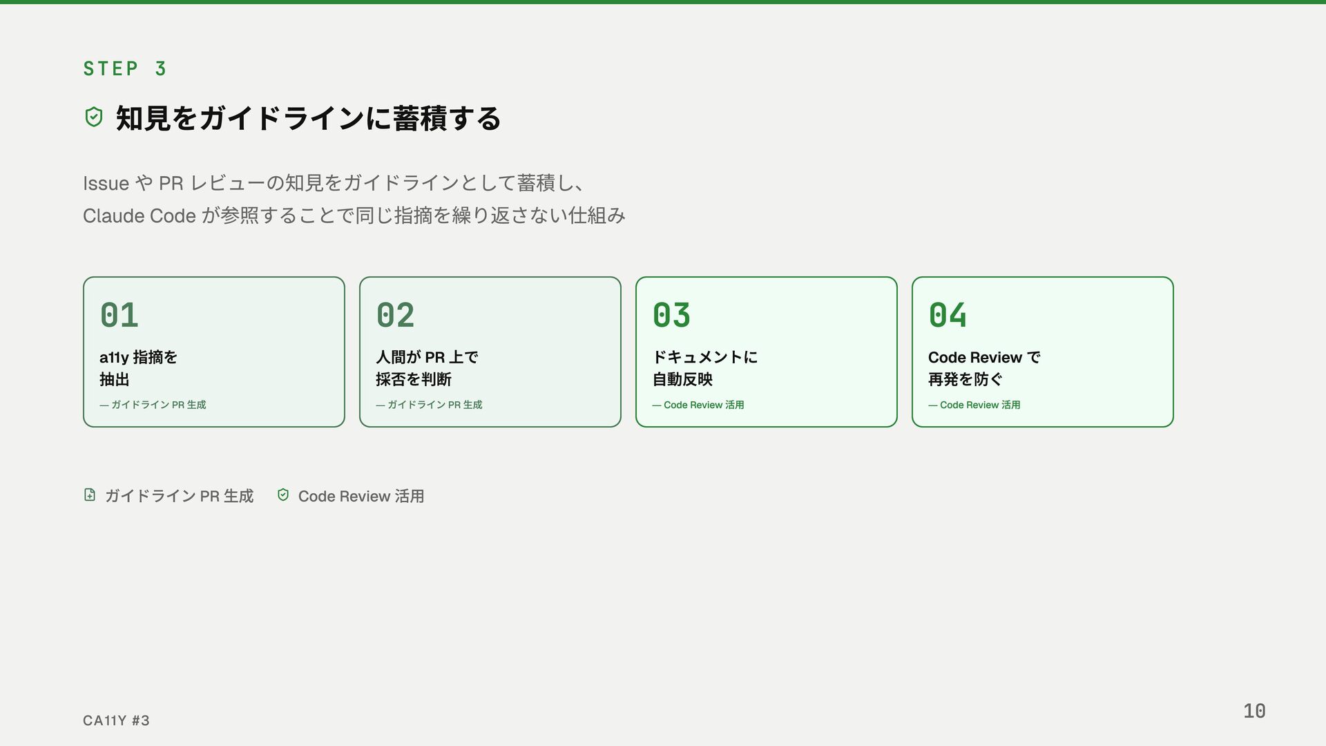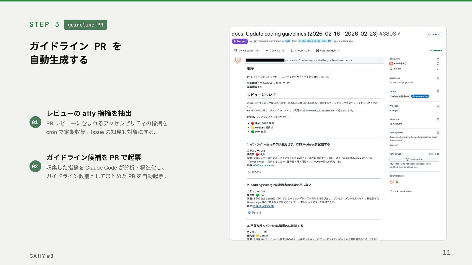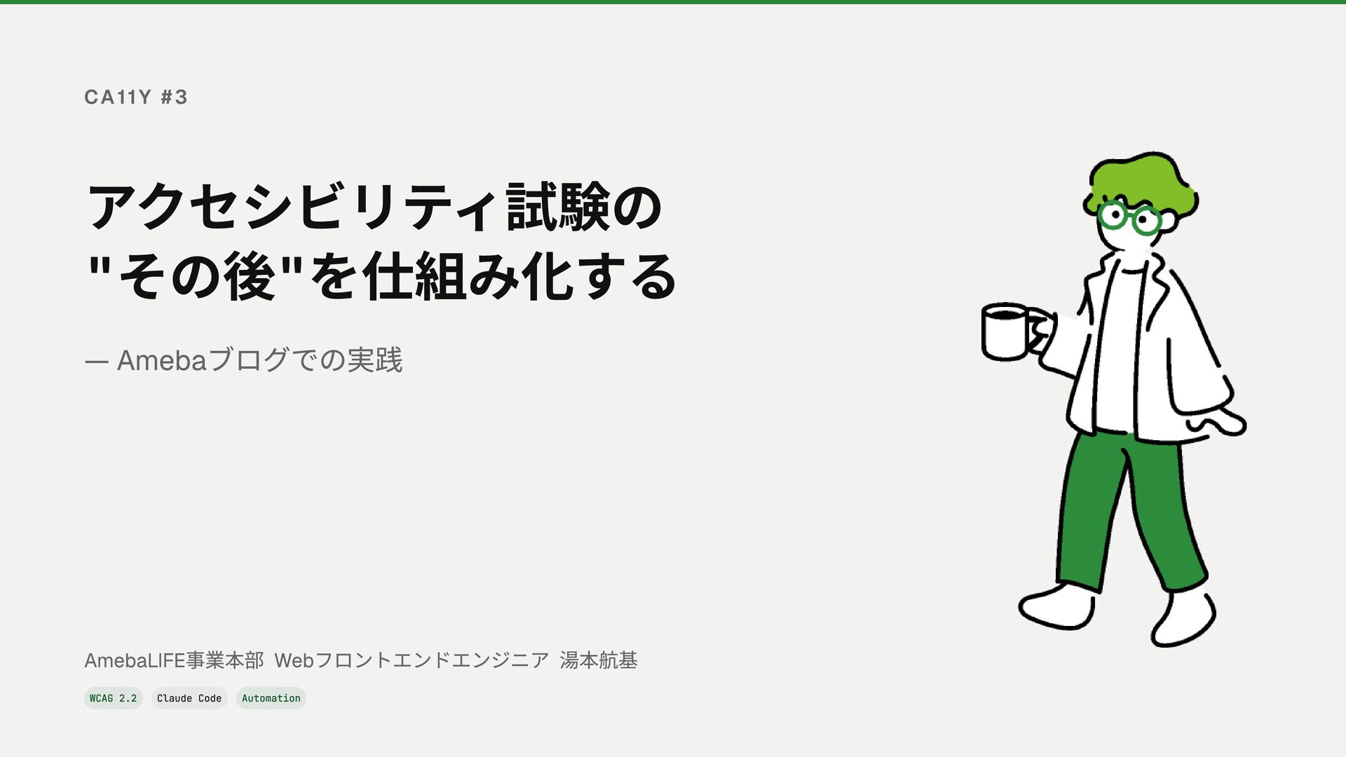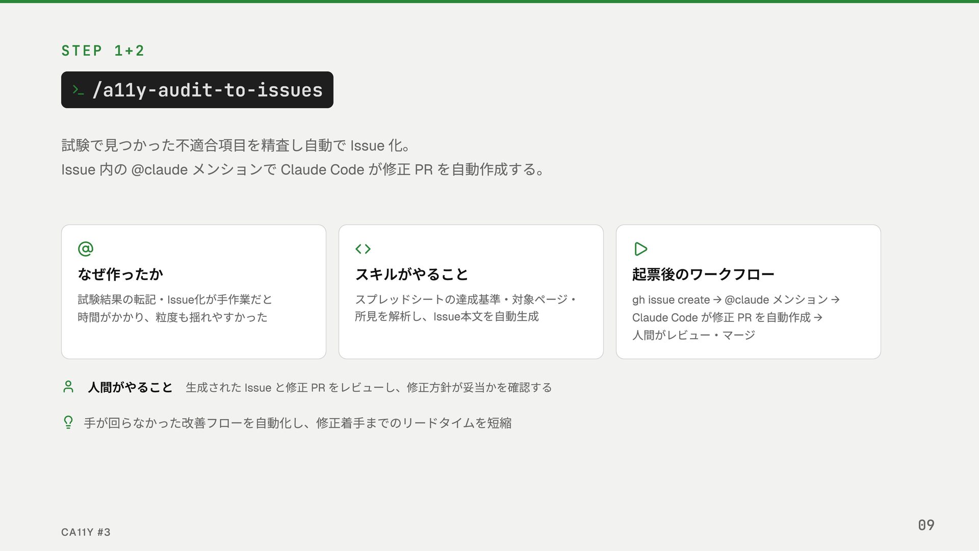 でチケットを切り担当者が分担。検証にはLighthouse ‧⽬視確認‧masuP9 さんのa11y-specialist-skills を併⽤。 進め⽅ 1 スプレッドシートに達成基準 × 対象ページのチェックリストを作成 2 Notion で達成基準ごとにチケットを作成、担当者を割り当て 3 Lighthouse ‧⽬視確認‧masuP9 さんのa11y-specialist-skills を併⽤して検証 4 アクセシビリティチームで議論し、判定や対応⽅針を決定 github.com/masuP9/a11y-specialist-skills 試験記録(スプレッドシート抜粋) 達成基準 LV 適⽤ 結果 件数 担当 1.1.1 ⾮テキストコンテン ツ A 適⽤ ⾮適合 5 QCチーム 1.3.2 意味のある順序 A 適⽤ 適合 0 ⼭⽥太郎 2.1.1 キーボード A 適⽤ 適合 0 QCチーム 3.1.1 ページの⾔語 A 適⽤ 適合 0 佐藤花⼦ ※ 2 種類のシート構成: ① 達成基準ごとの総括(上表)② ページ別テスト詳細(タブ別に 1.1.1, 1.3.1 ... と管理) 05 CA11Y #3