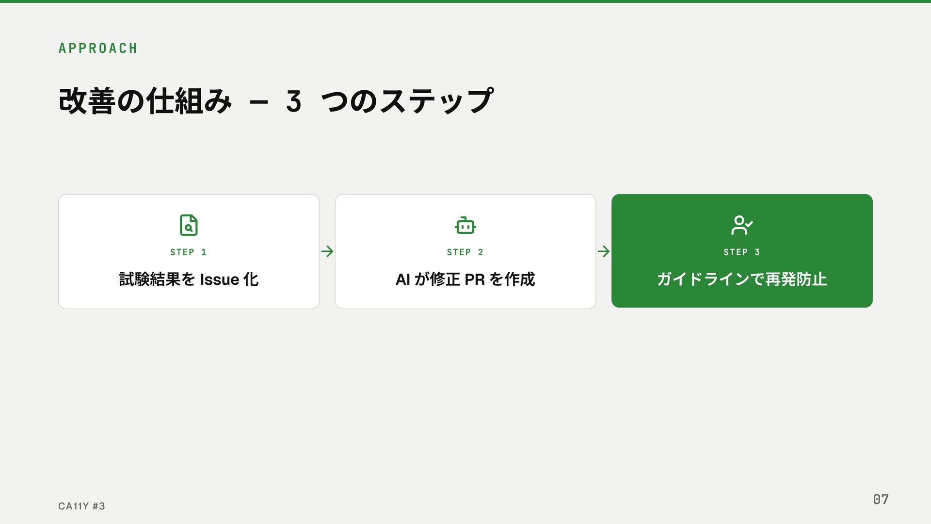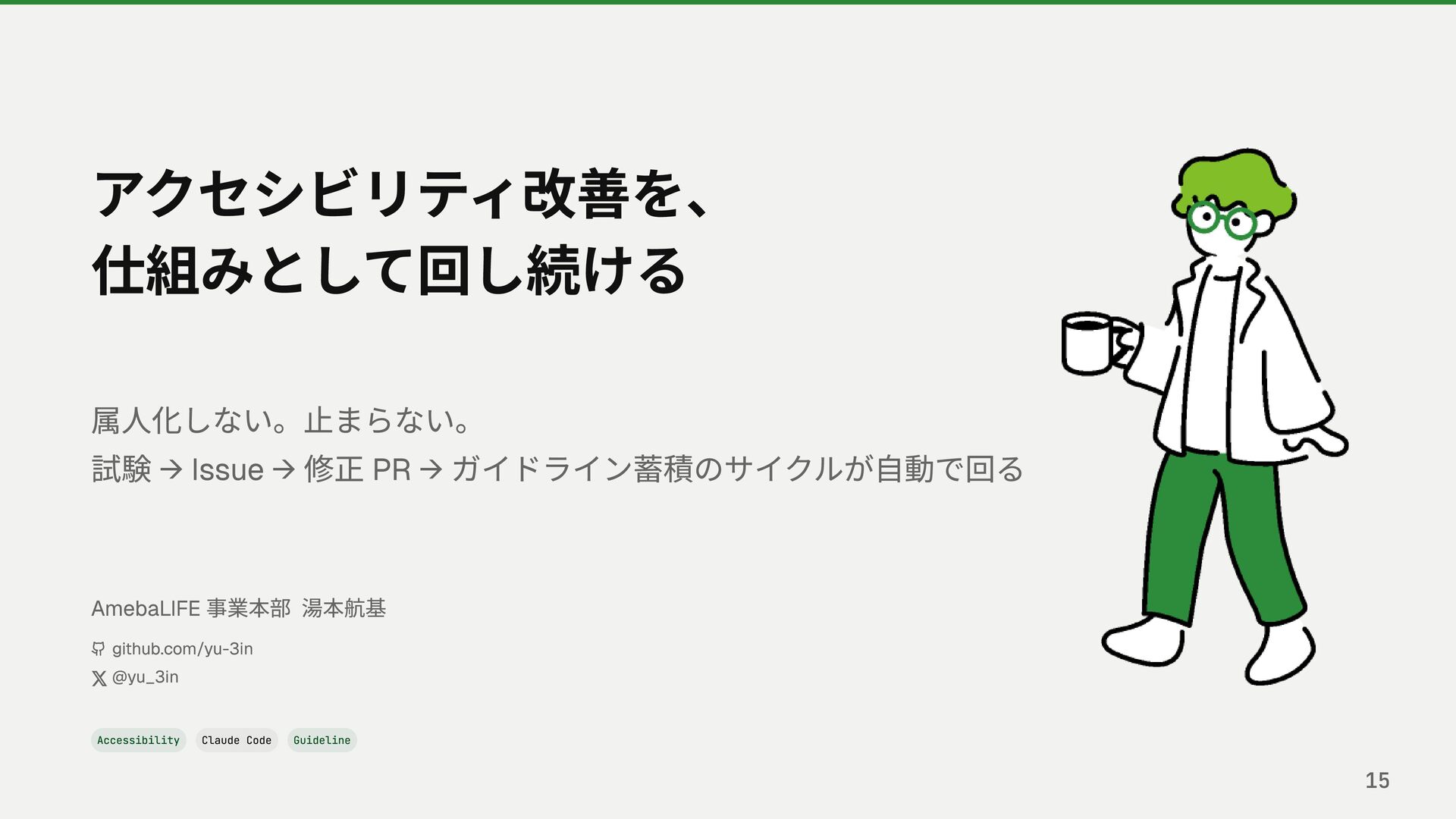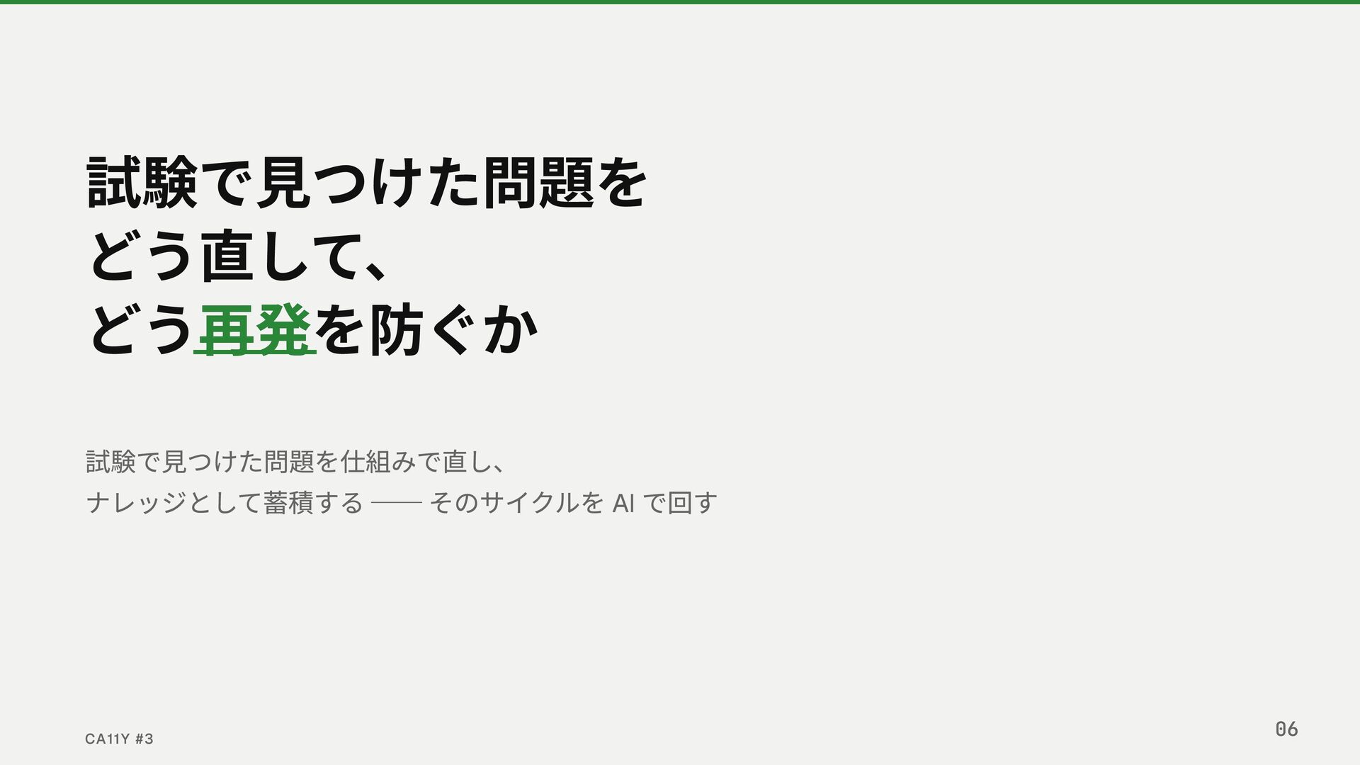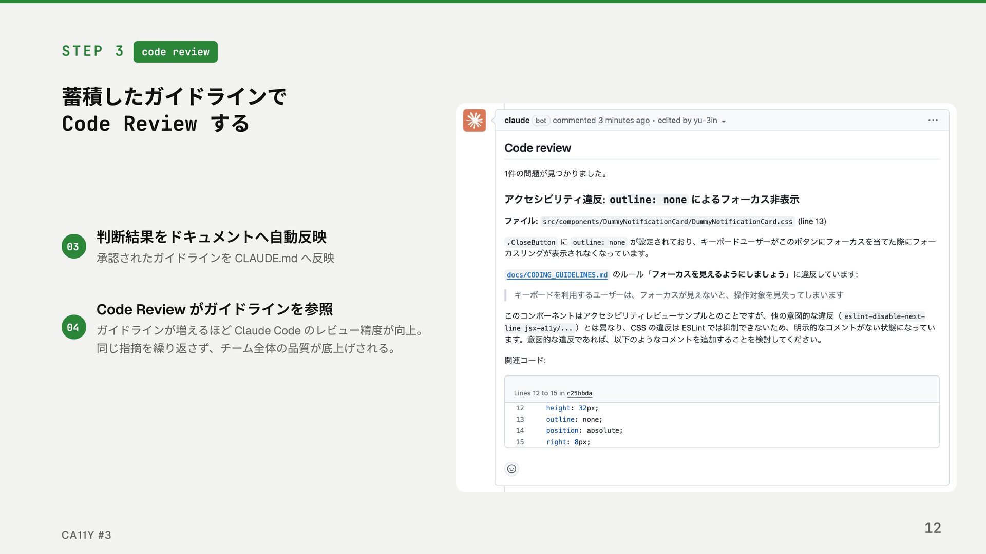 でチケットを切り担当者が分担。検証にはLighthouse ‧⽬視確認‧masuP9 さんのa11y-specialist-skills を併⽤。 進め⽅ 1 スプレッドシートに達成基準 × 対象ページのチェックリストを作成 2 Notion で達成基準ごとにチケットを作成、担当者を割り当て 3 Lighthouse ‧⽬視確認‧masuP9 さんのa11y-specialist-skills を併⽤して検証 4 アクセシビリティチームで議論し、判定や対応⽅針を決定 github.com/masuP9/a11y-specialist-skills 試験記録(スプレッドシート抜粋) 達成基準 LV 適⽤ 結果 件数 担当 1.1.1 ⾮テキストコンテン ツ A 適⽤ ⾮適合 5 QCチーム 1.3.2 意味のある順序 A 適⽤ 適合 0 ⼭⽥太郎 2.1.1 キーボード A 適⽤ 適合 0 QCチーム 3.1.1 ページの⾔語 A 適⽤ 適合 0 佐藤花⼦ ※ 2 種類のシート構成: ① 達成基準ごとの総括(上表)② ページ別テスト詳細(タブ別に 1.1.1, 1.3.1 ... と管理) 05 CA11Y #3