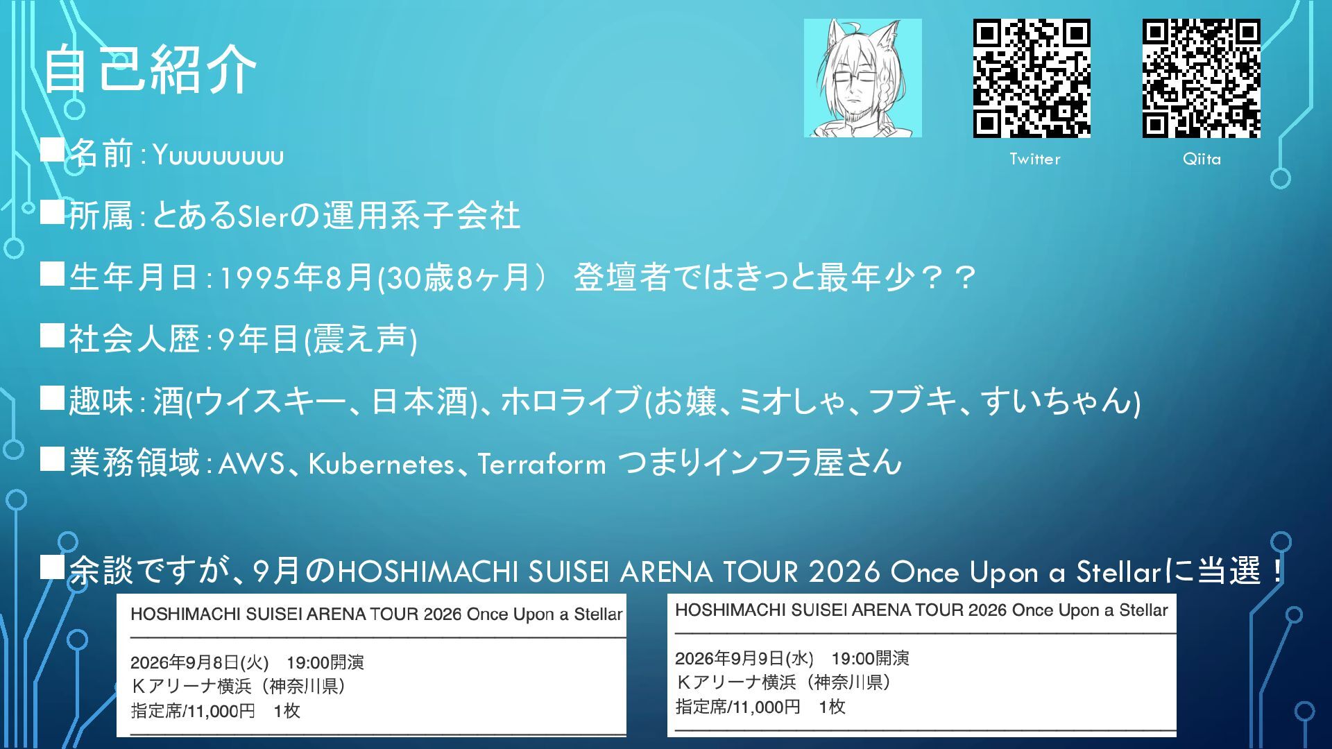 自己紹介 ◼名前:Yuuuuuuuu ◼所属:とあるSIerの運用系子会社 ◼生年月日:1995年8月(30歳8ヶ月) 登壇者ではきっと最年少?? ◼社会人歴:9年目(震え声) ◼趣味:酒(ウイスキー、日本酒)、ホロライブ(お嬢、ミオしゃ、フブキ、すいちゃん) ◼業務領域:AWS、Kubernetes、Terraform つまりインフラ屋さん ◼余談ですが、9月のHOSHIMACHI