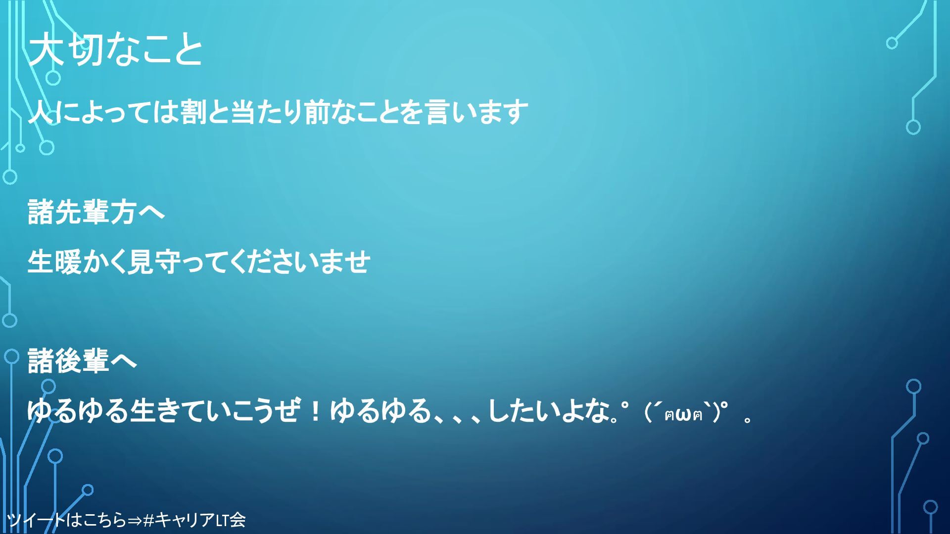 大切なこと 人によっては割と当たり前なことを言います 諸先輩方へ 生暖かく見守ってくださいませ 諸後輩へ ゆるゆる生きていこうぜ!ゆるゆる、、、したいよな。°(´ฅωฅ`)°。 ツイートはこちら⇒#キャリアLT会