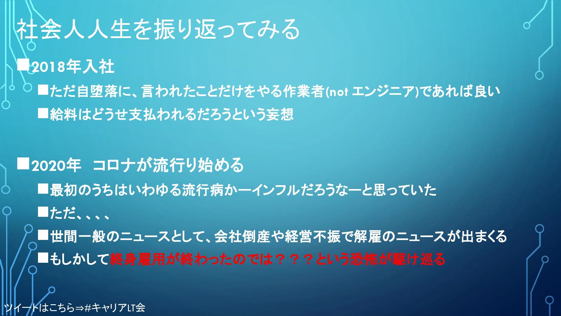 社会人人生を振り返ってみる ◼2018年入社 ◼ただ自堕落に、言われたことだけをやる作業者(not エンジニア)であれば良い ◼給料はどうせ支払われるだろうという妄想 ◼2020年 コロナが流行り始める ◼最初のうちはいわゆる流行病かーインフルだろうなーと思っていた ◼ただ、、、、 ◼世間一般のニュースとして、会社倒産や経営不振で解雇のニュースが出まくる