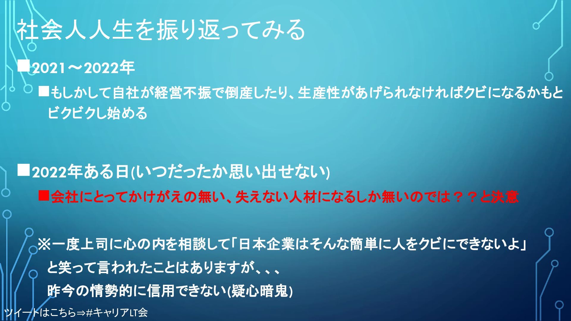 社会人人生を振り返ってみる ◼2021〜2022年 ◼もしかして自社が経営不振で倒産したり、生産性があげられなければクビになるかもと ビクビクし始める ◼2022年ある日(いつだったか思い出せない) ◼会社にとってかけがえの無い、失えない人材になるしか無いのでは??と決意 ※一度上司に心の内を相談して「日本企業はそんな簡単に人をクビにできないよ」 と笑って言われたことはありますが、、、 昨今の情勢的に信用できない(疑心暗鬼) ツイートはこちら⇒#キャリアLT会