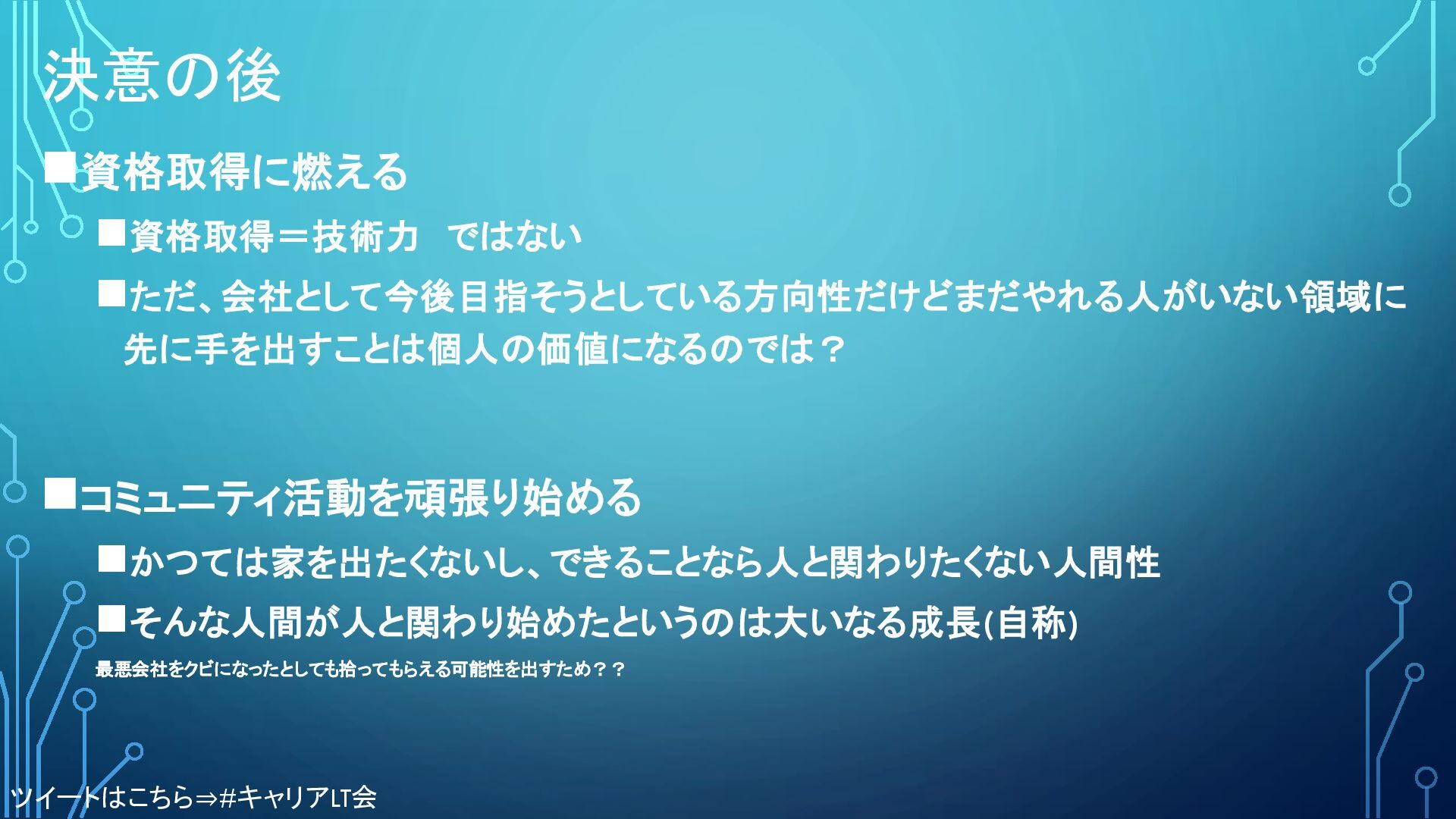 決意の後 ◼資格取得に燃える ◼資格取得=技術力 ではない ◼ただ、会社として今後目指そうとしている方向性だけどまだやれる人がいない領域に 先に手を出すことは個人の価値になるのでは? ◼コミュニティ活動を頑張り始める ◼かつては家を出たくないし、できることなら人と関わりたくない人間性 ◼そんな人間が人と関わり始めたというのは大いなる成長(自称) 最悪会社をクビになったとしても拾ってもらえる可能性を出すため??
