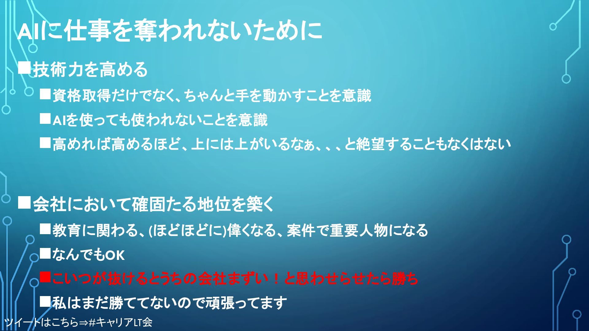 AIに仕事を奪われないために ◼技術力を高める ◼資格取得だけでなく、ちゃんと手を動かすことを意識 ◼AIを使っても使われないことを意識 ◼高めれば高めるほど、上には上がいるなぁ、、、と絶望することもなくはない ◼会社において確固たる地位を築く ◼教育に関わる、(ほどほどに)偉くなる、案件で重要人物になる ◼なんでもOK ◼こいつが抜けるとうちの会社まずい!と思わせらせたら勝ち ◼私はまだ勝ててないので頑張ってます