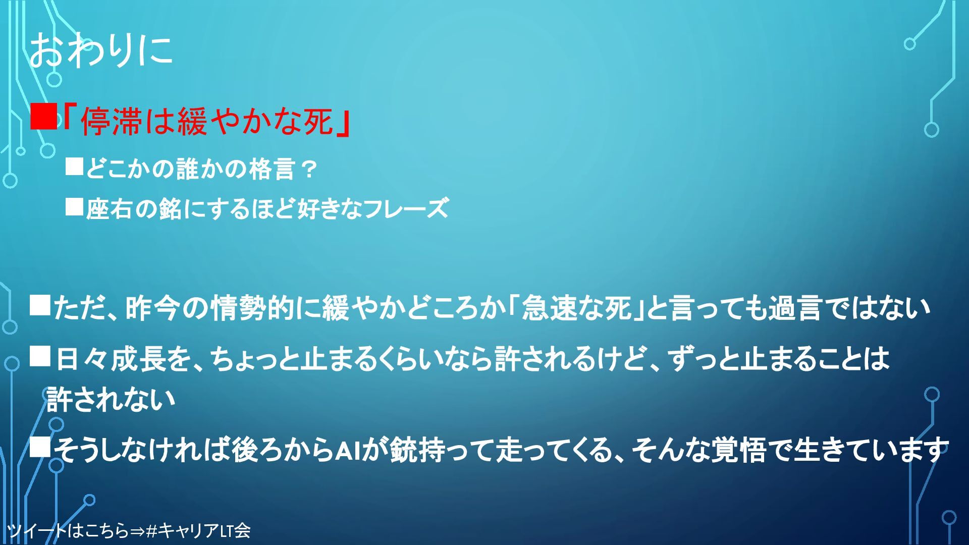 おわりに ◼「停滞は緩やかな死」 ◼どこかの誰かの格言? ◼座右の銘にするほど好きなフレーズ ◼ただ、昨今の情勢的に緩やかどころか「急速な死」と言っても過言ではない ◼日々成長を、ちょっと止まるくらいなら許されるけど、ずっと止まることは 許されない ◼そうしなければ後ろからAIが銃持って走ってくる、そんな覚悟で生きています ツイートはこちら⇒#キャリアLT会