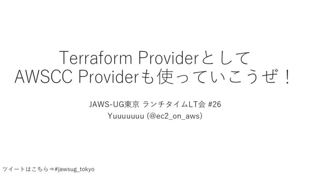 Terraform Providerとして AWSCC Providerも使っていこうぜ! JAWS-UG東京 ランチタイムLT会 #26 Yuuuuuuu (@ec2_on_aws) ツイートはこちら⇒#jawsug_tokyo