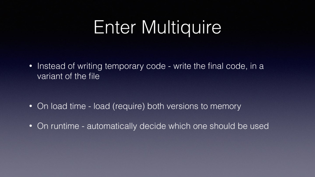 the final code, in a variant of the file • On load time - load (require) both versions to memory • On runtime - automatically decide which one should be used
