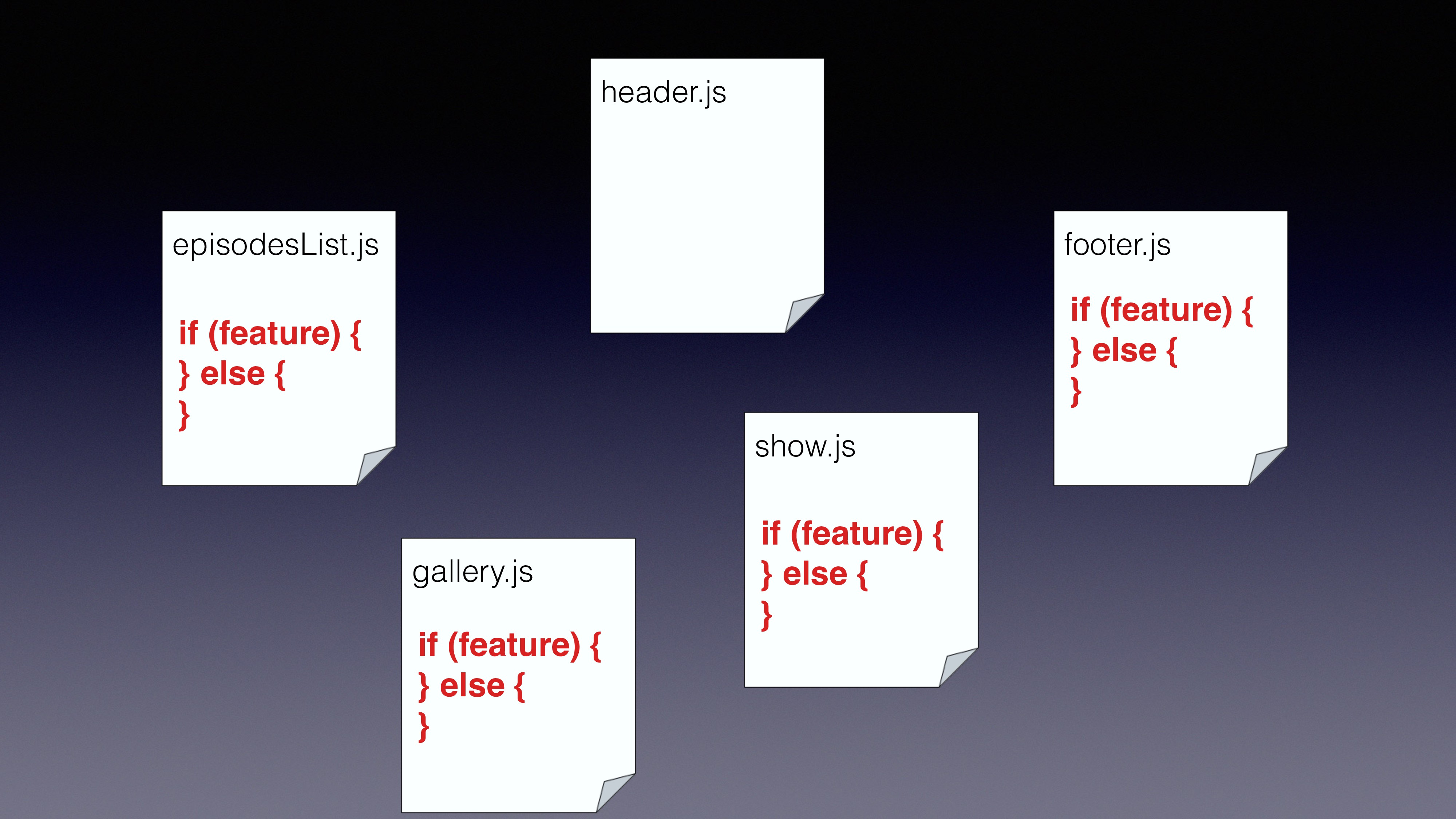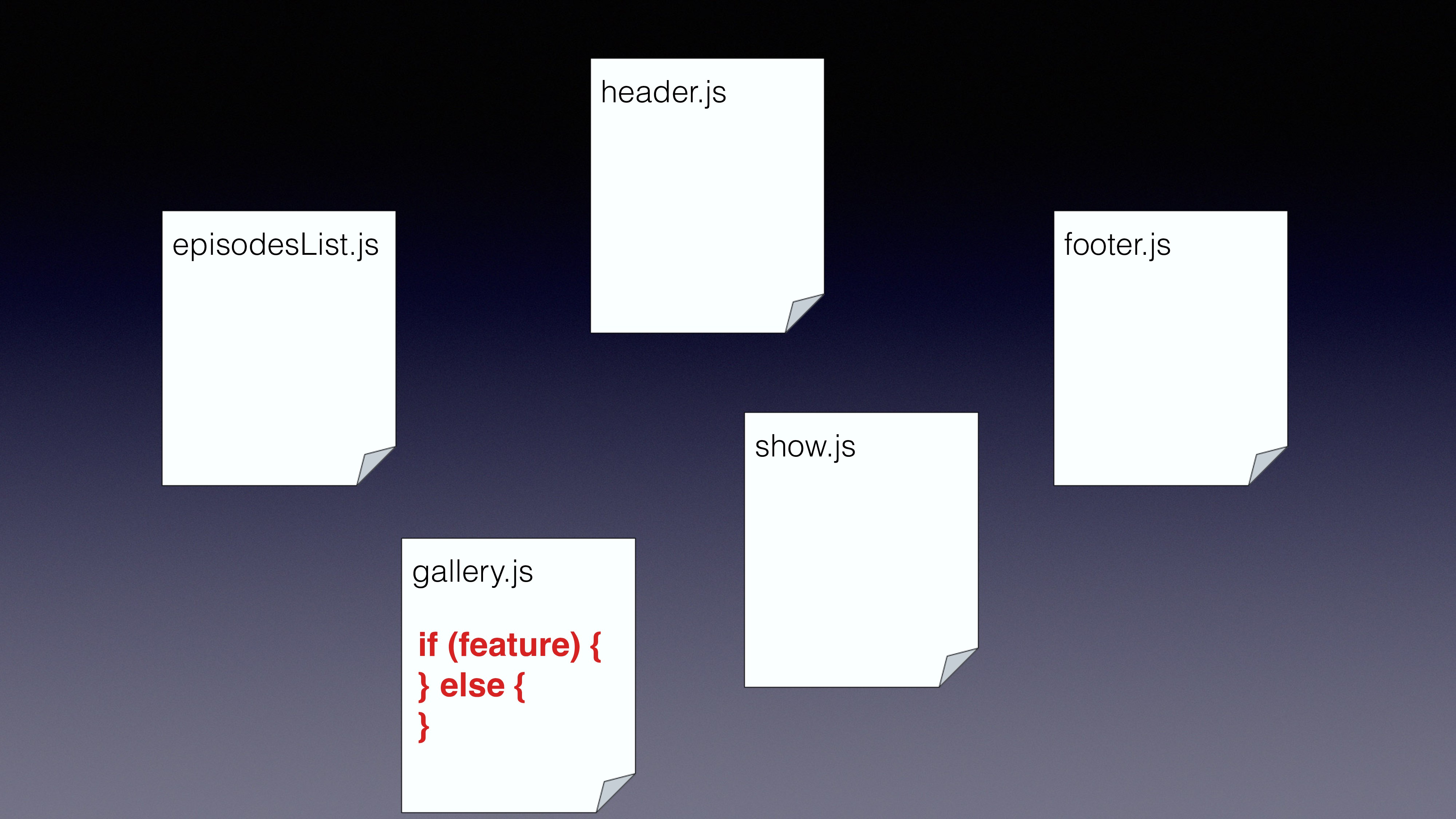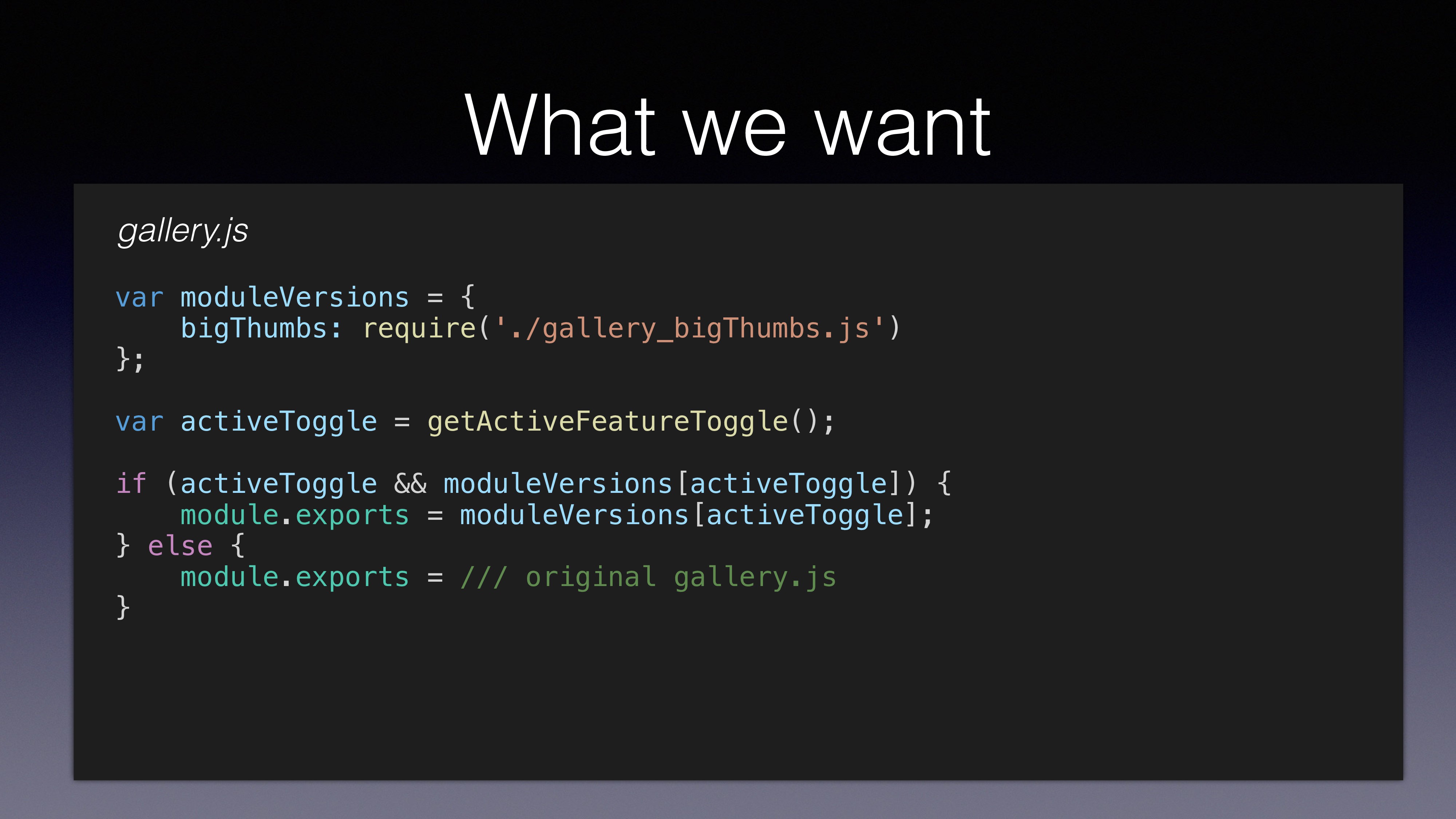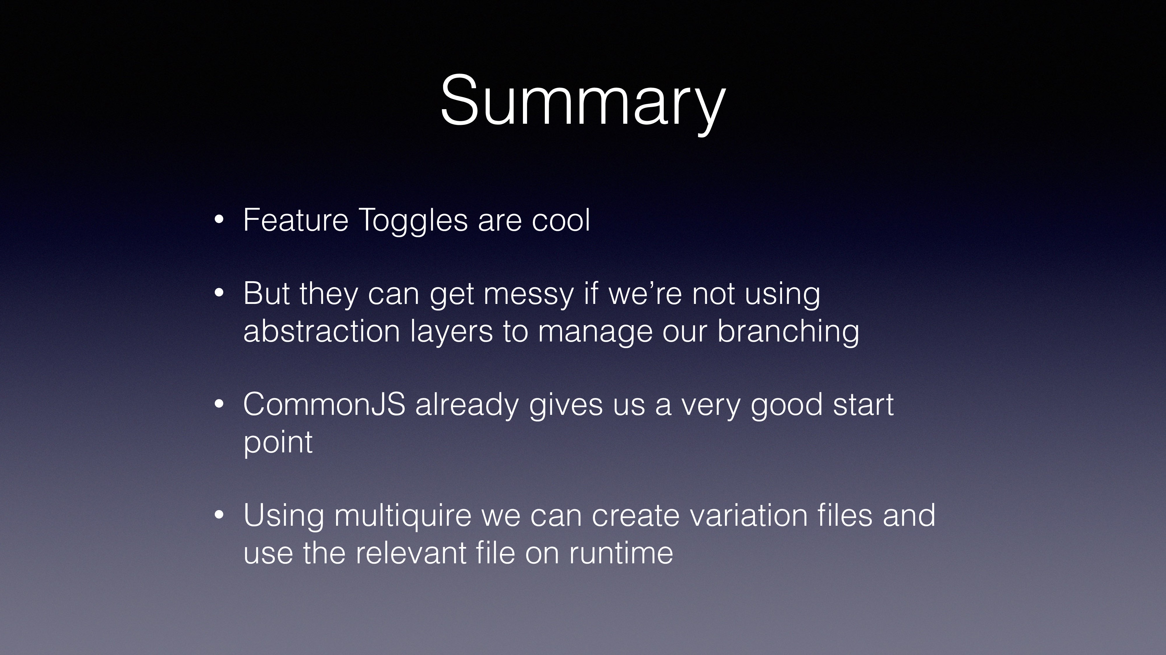 get messy if we’re not using abstraction layers to manage our branching • CommonJS already gives us a very good start point • Using multiquire we can create variation files and use the relevant file on runtime