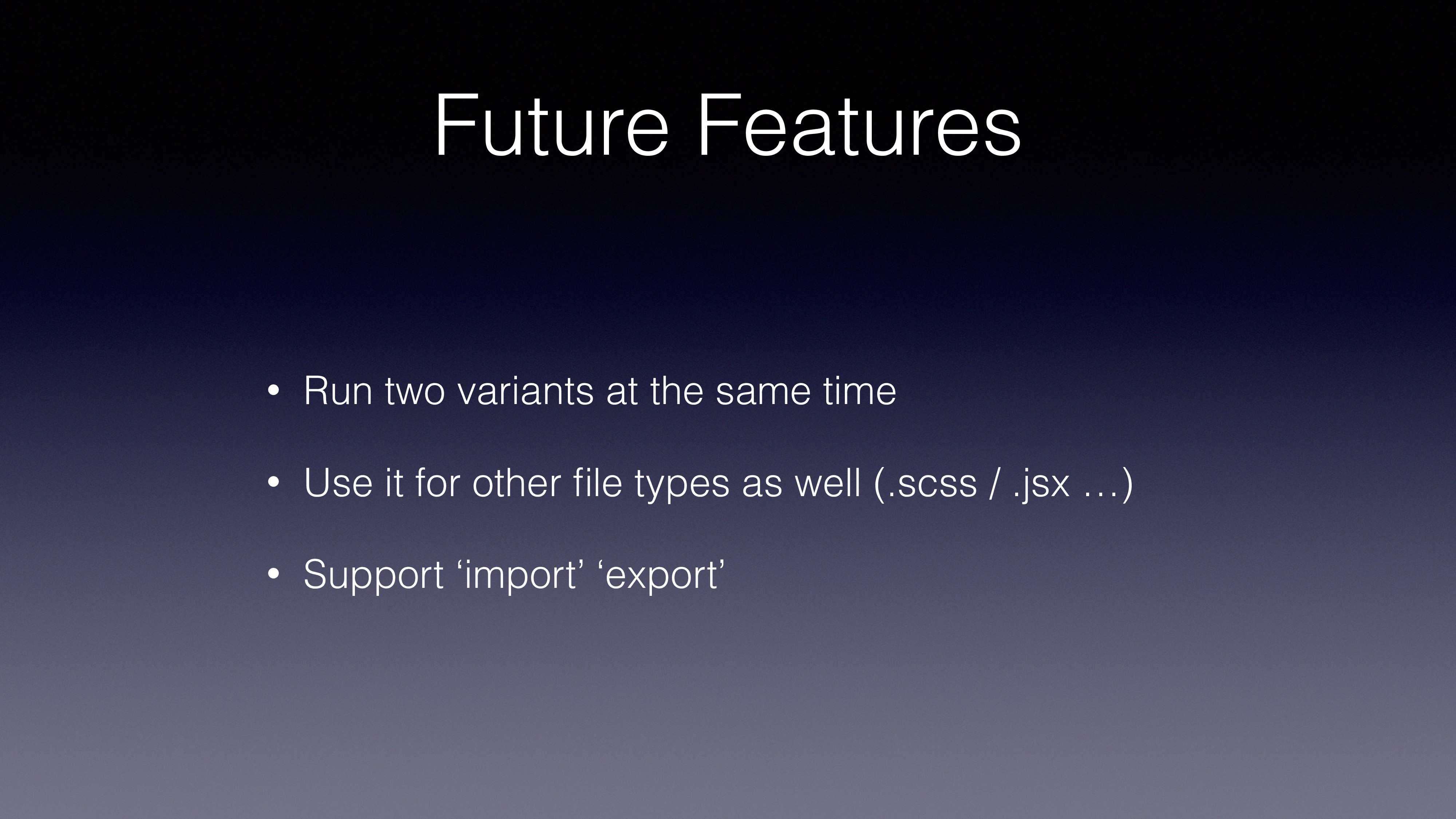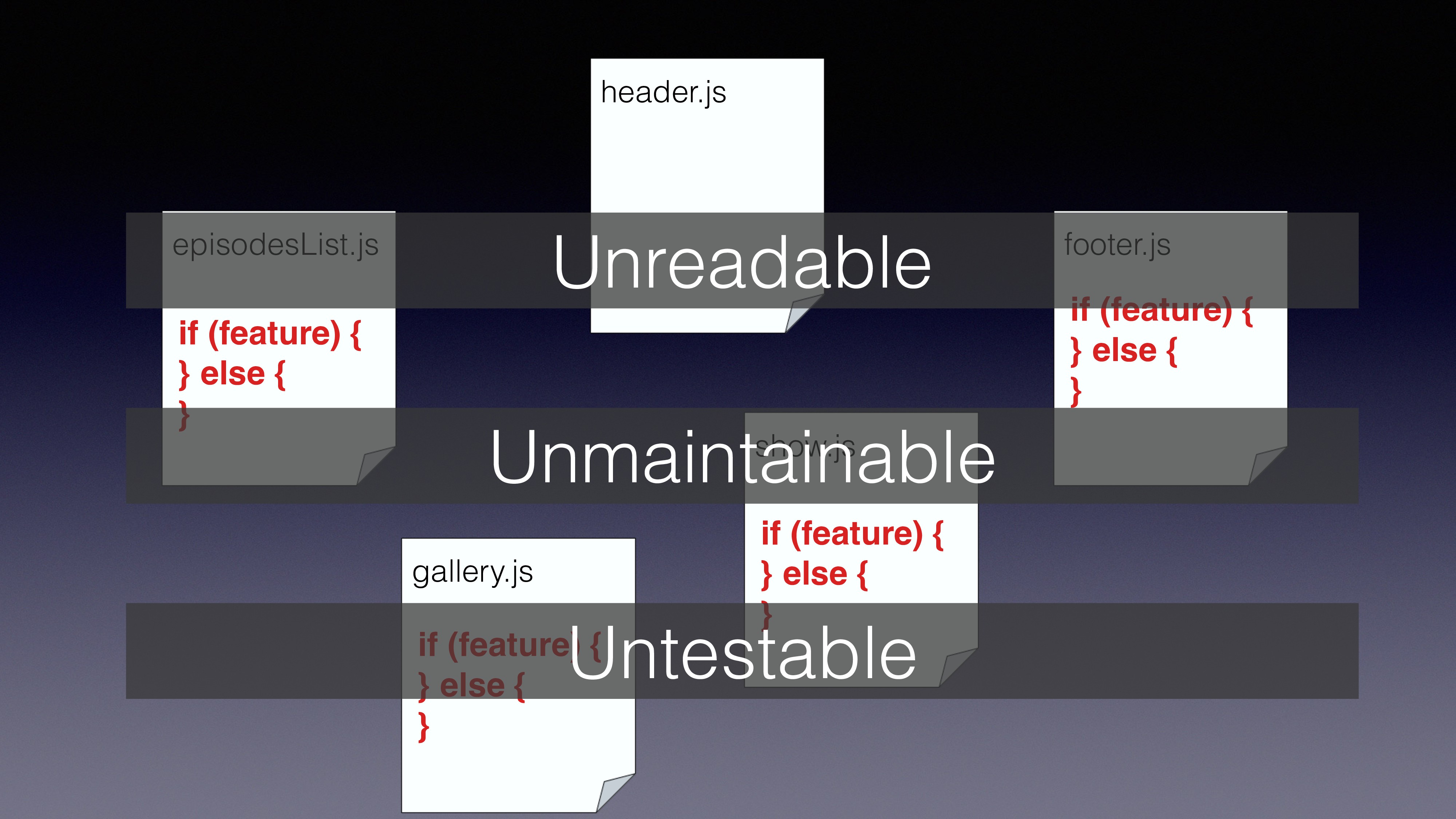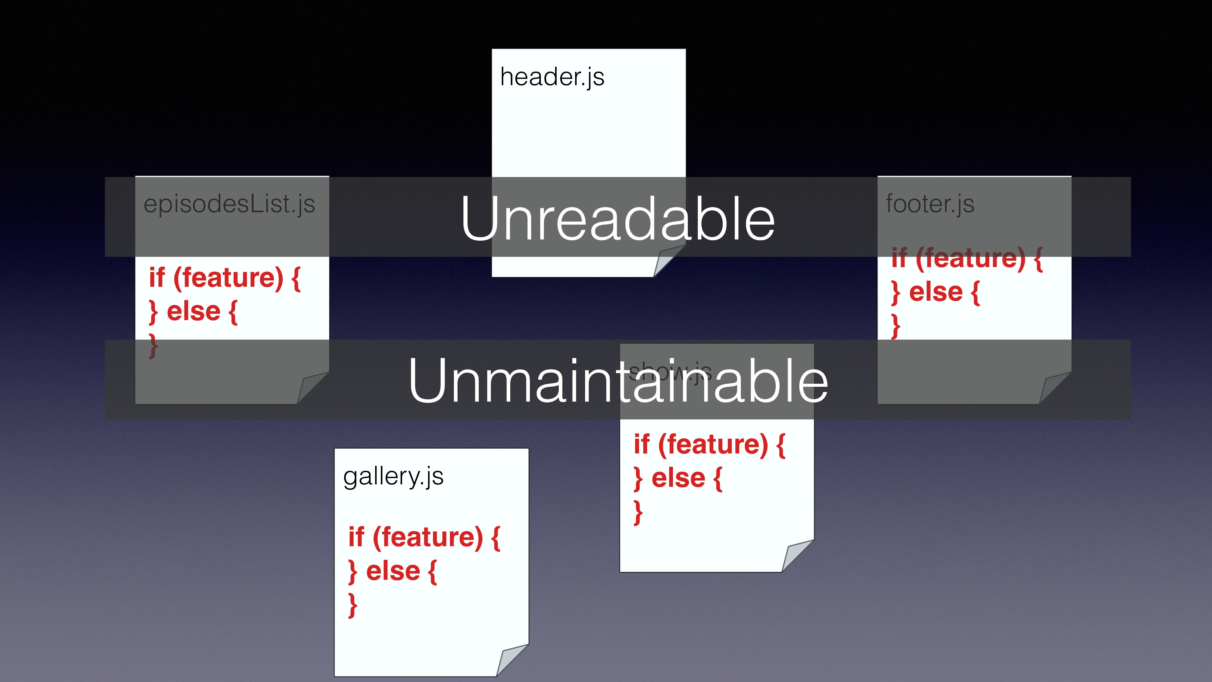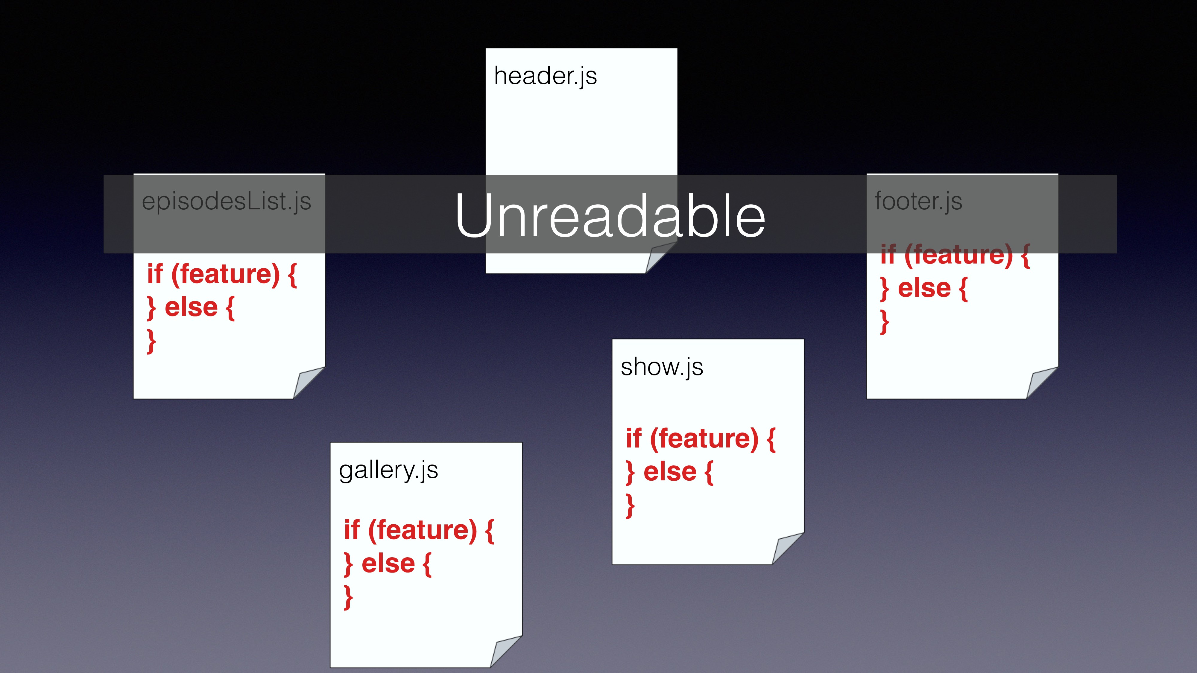 get messy if we’re not using abstraction layers to manage our branching • CommonJS already gives us a very good start point • Using multiquire we can create variation files and use the relevant file on runtime