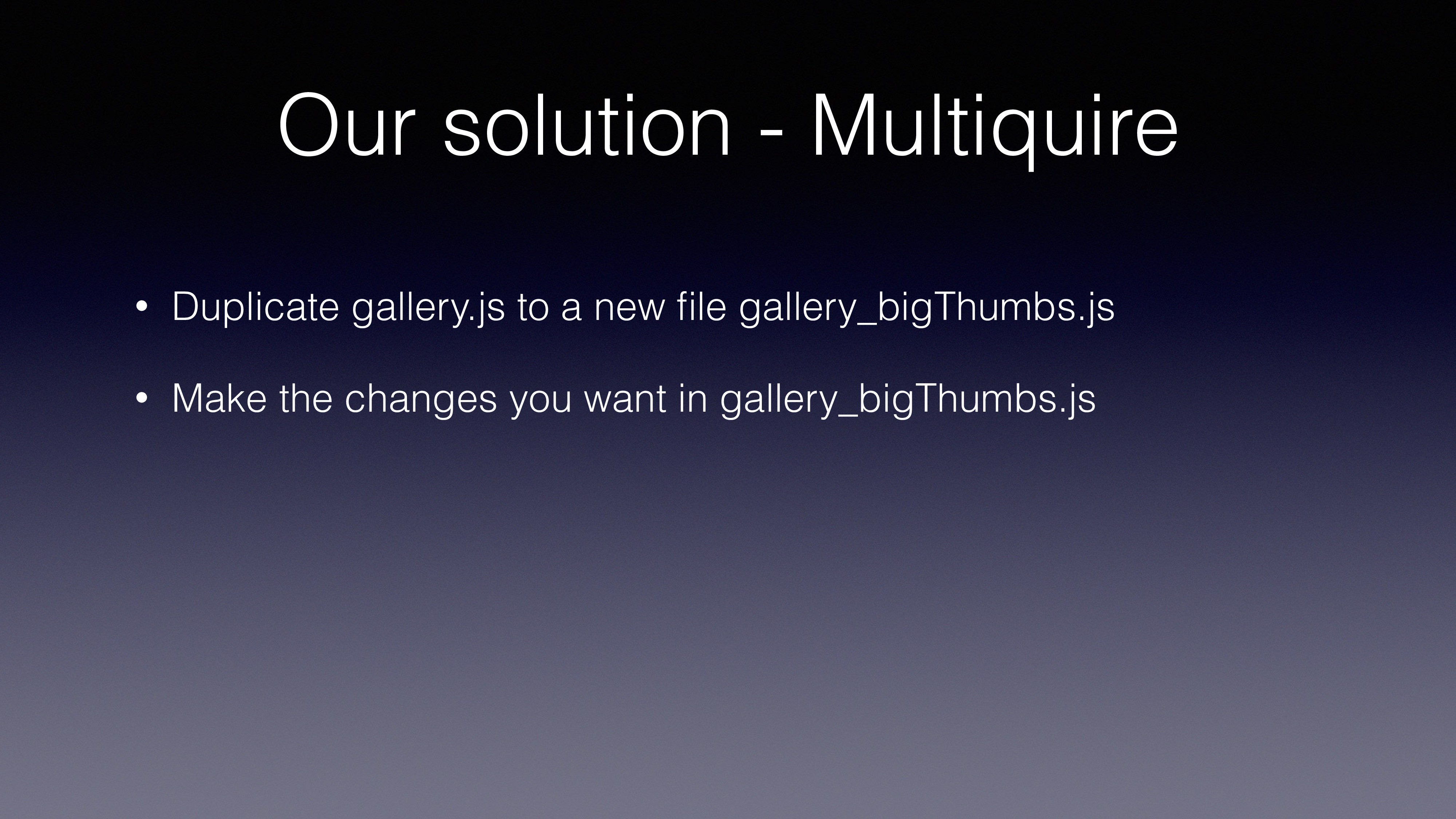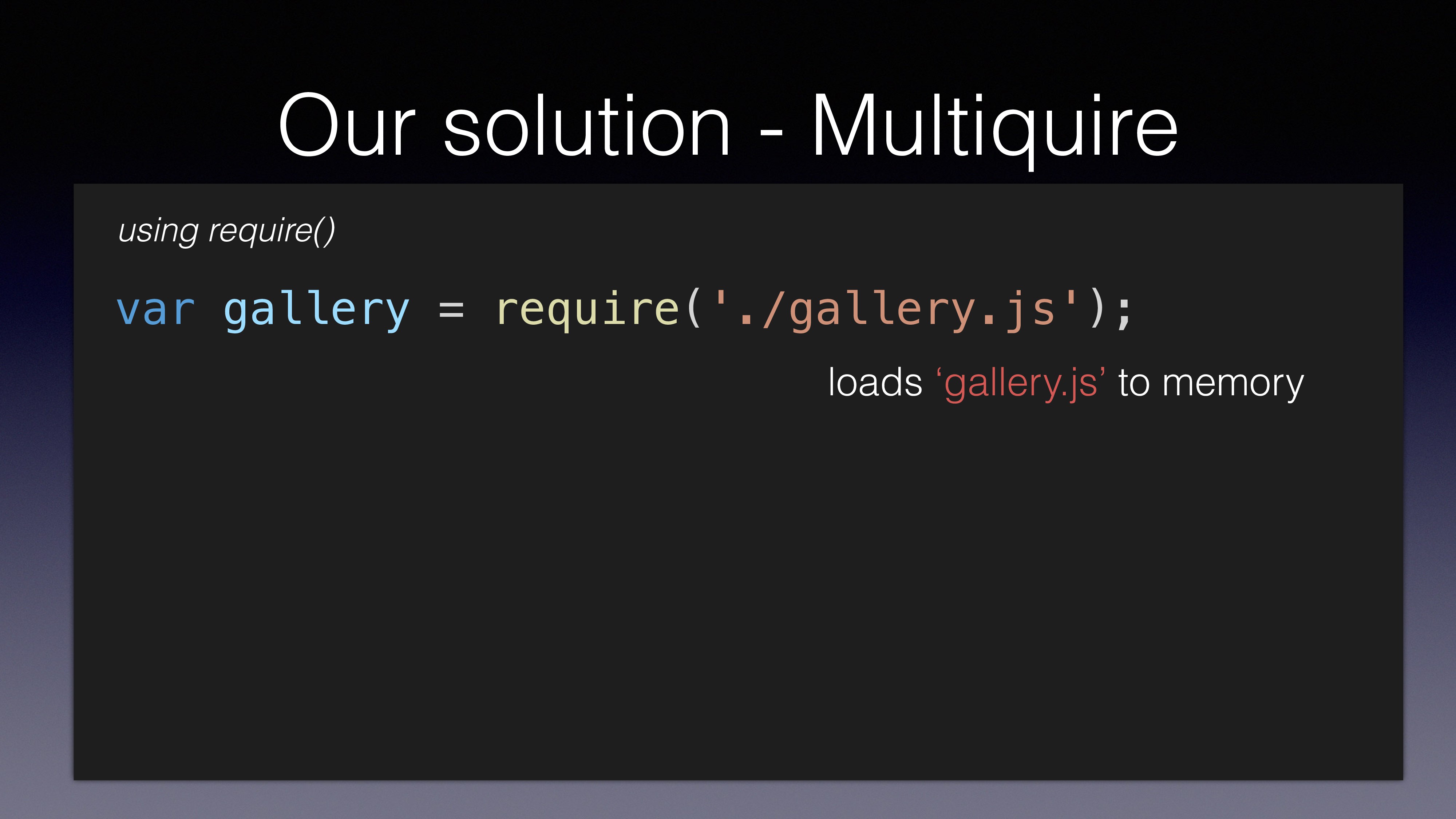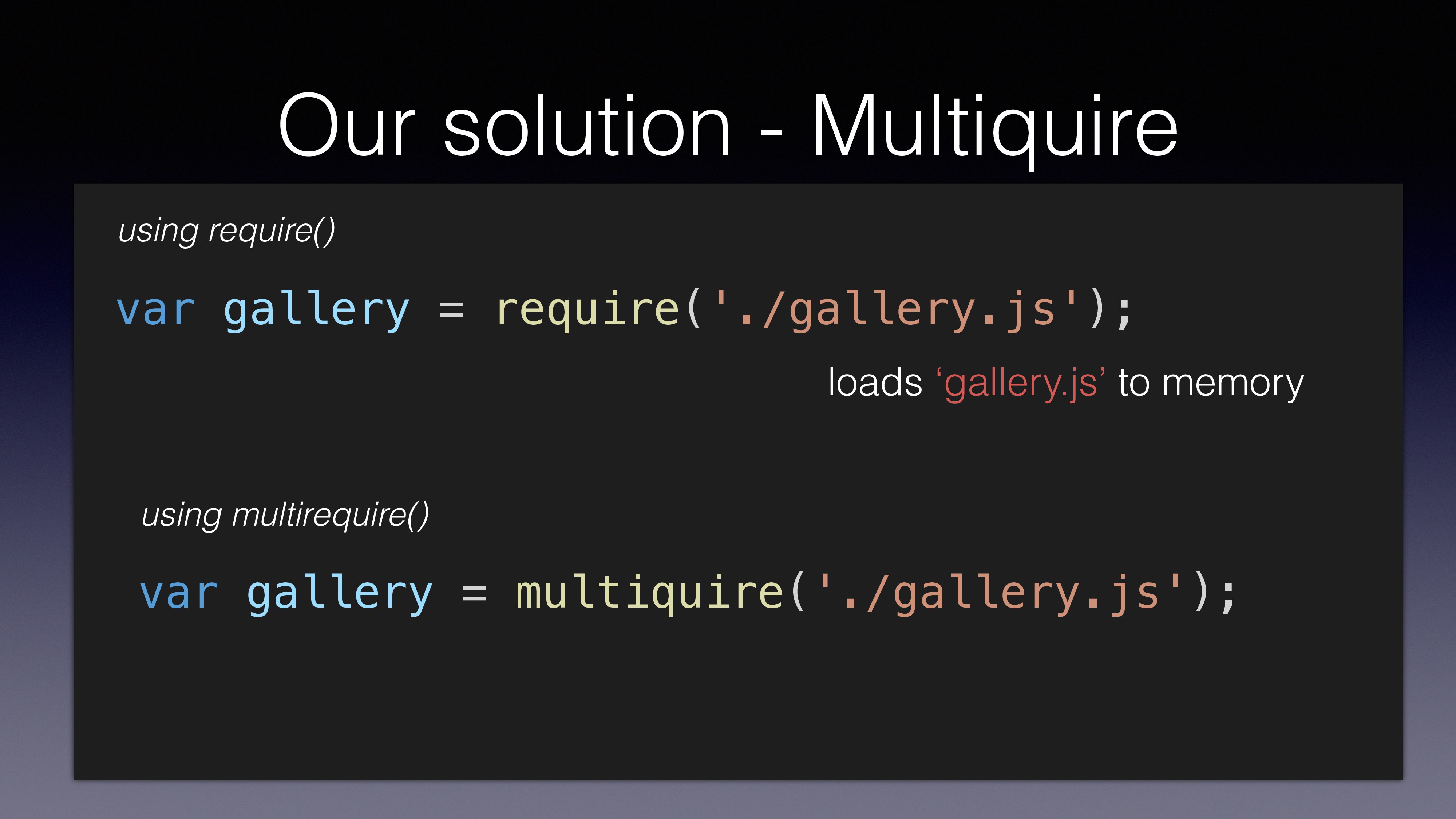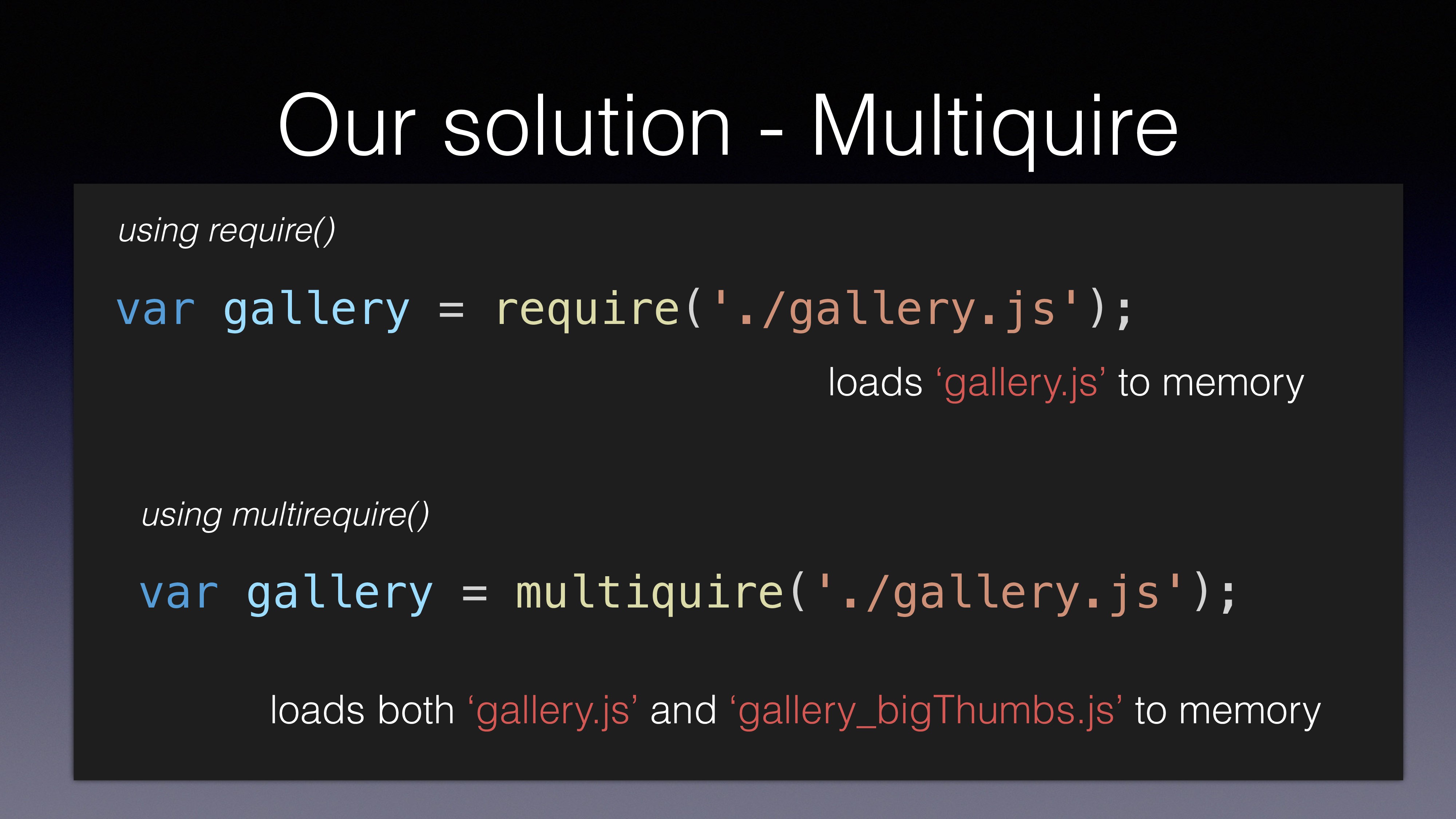 var gallery = multiquire('./gallery.js'); using multirequire() loads ‘gallery.js’ to memory loads both ‘gallery.js’ and ‘gallery_bigThumbs.js’ to memory