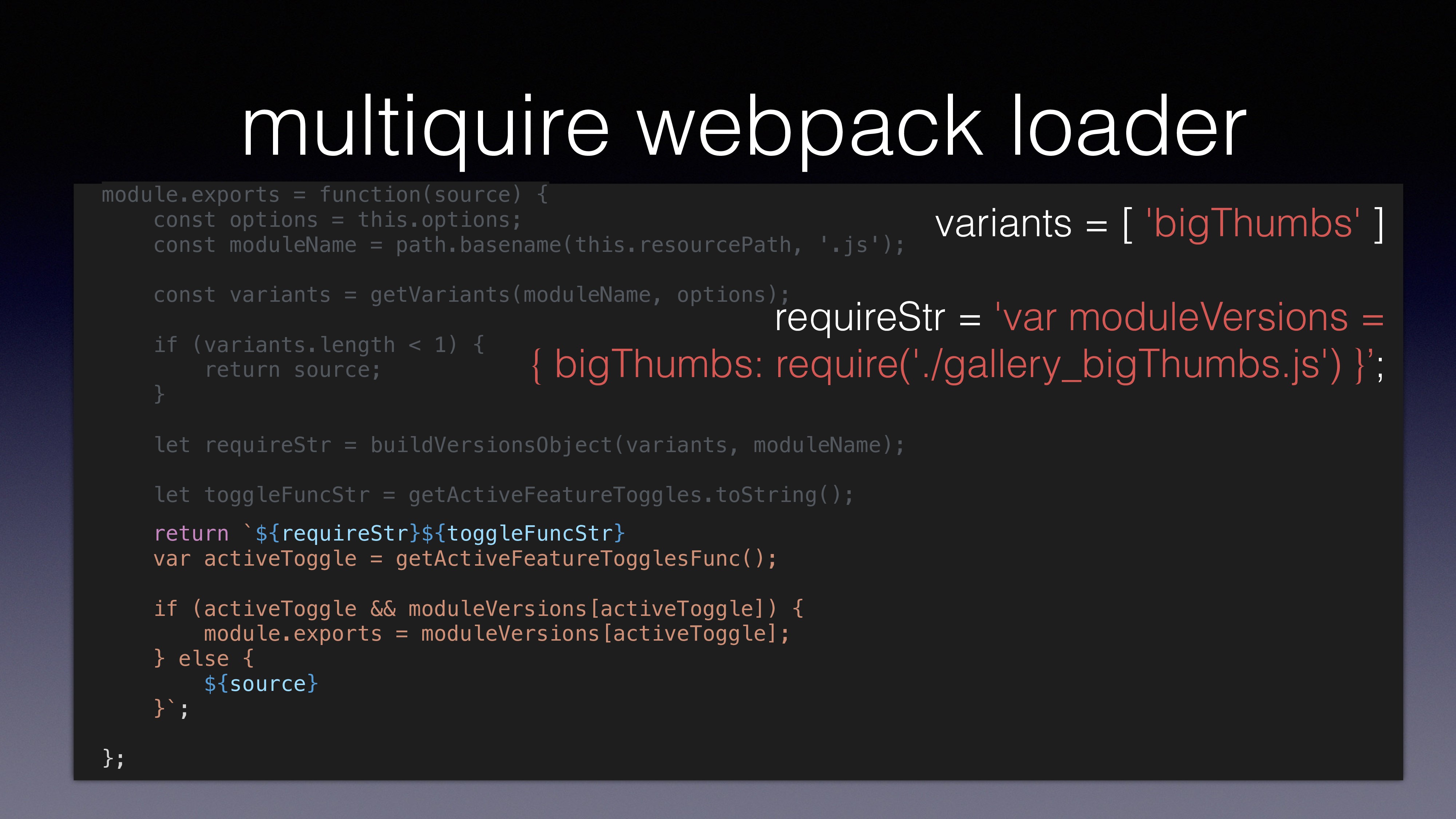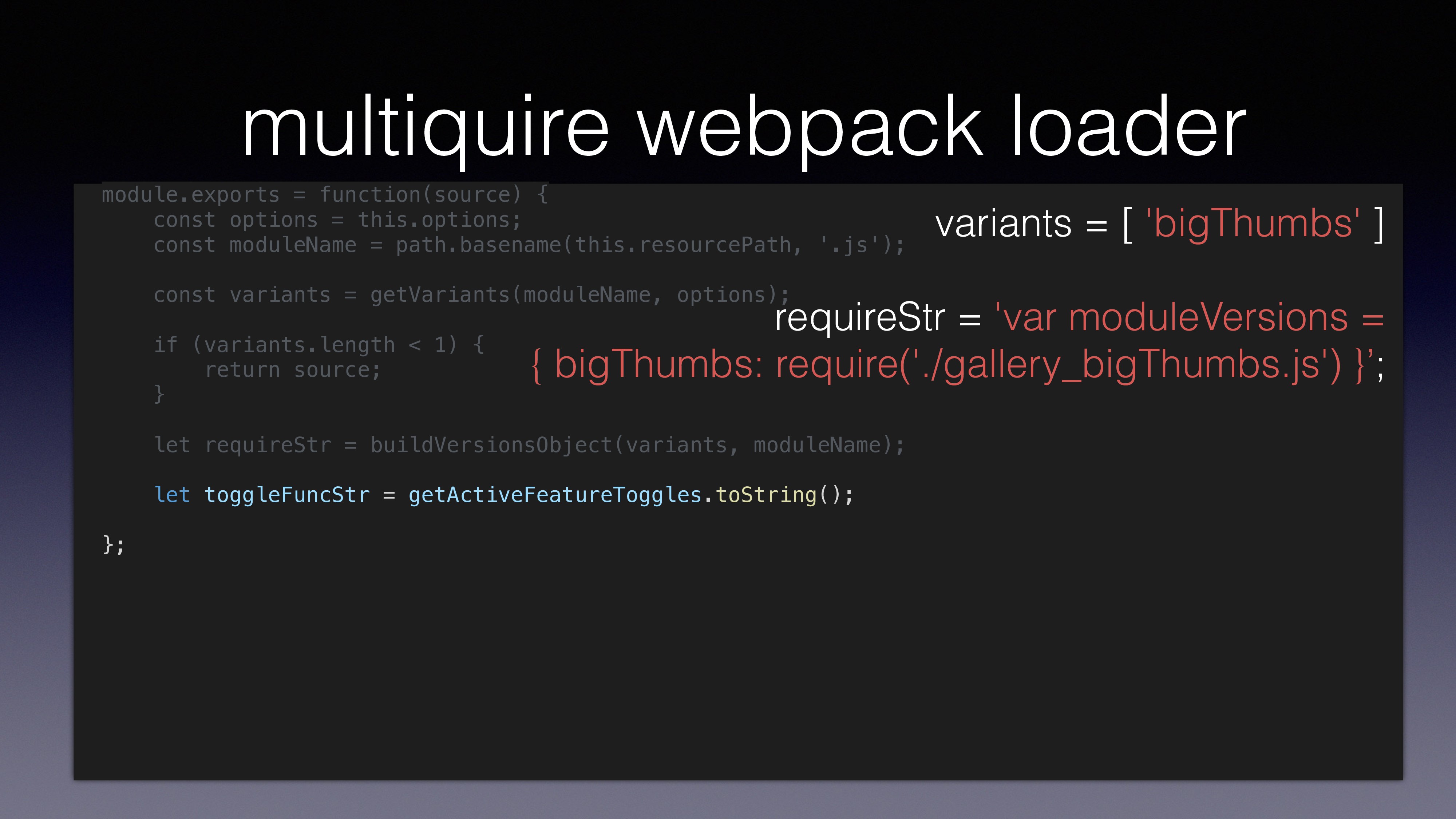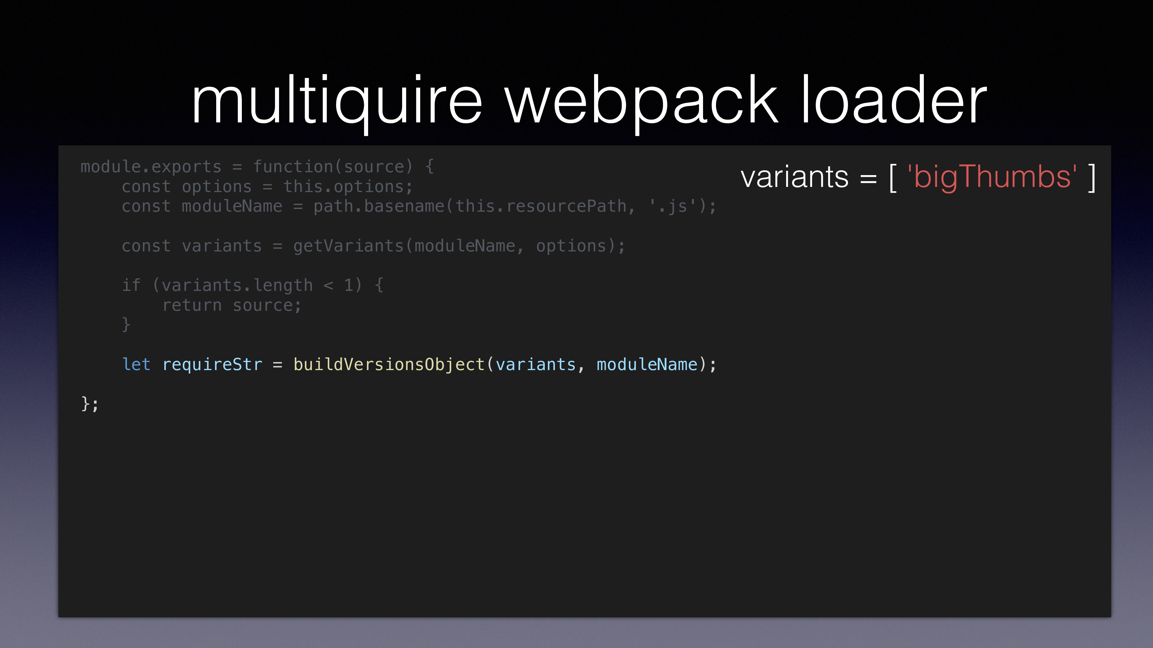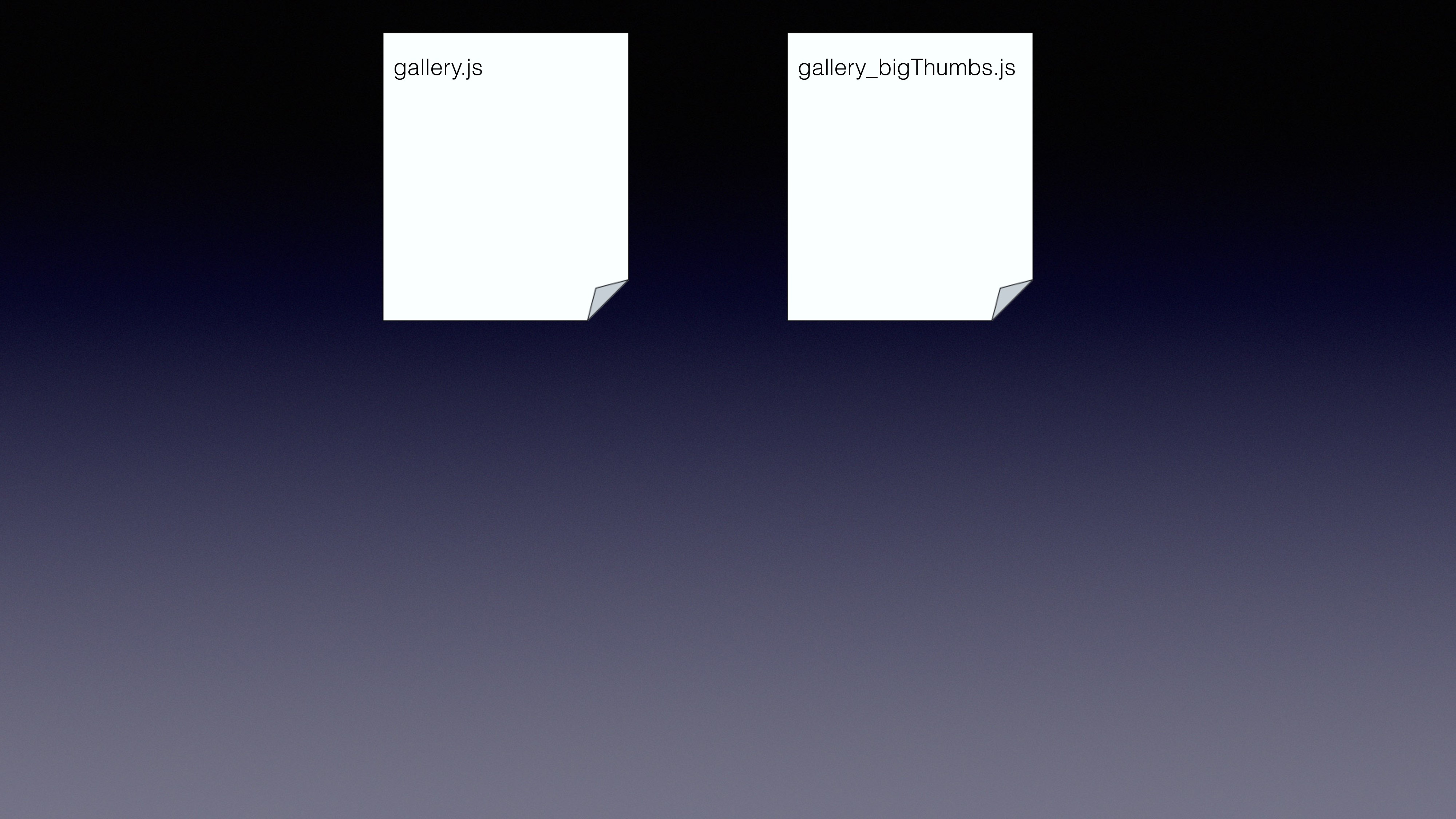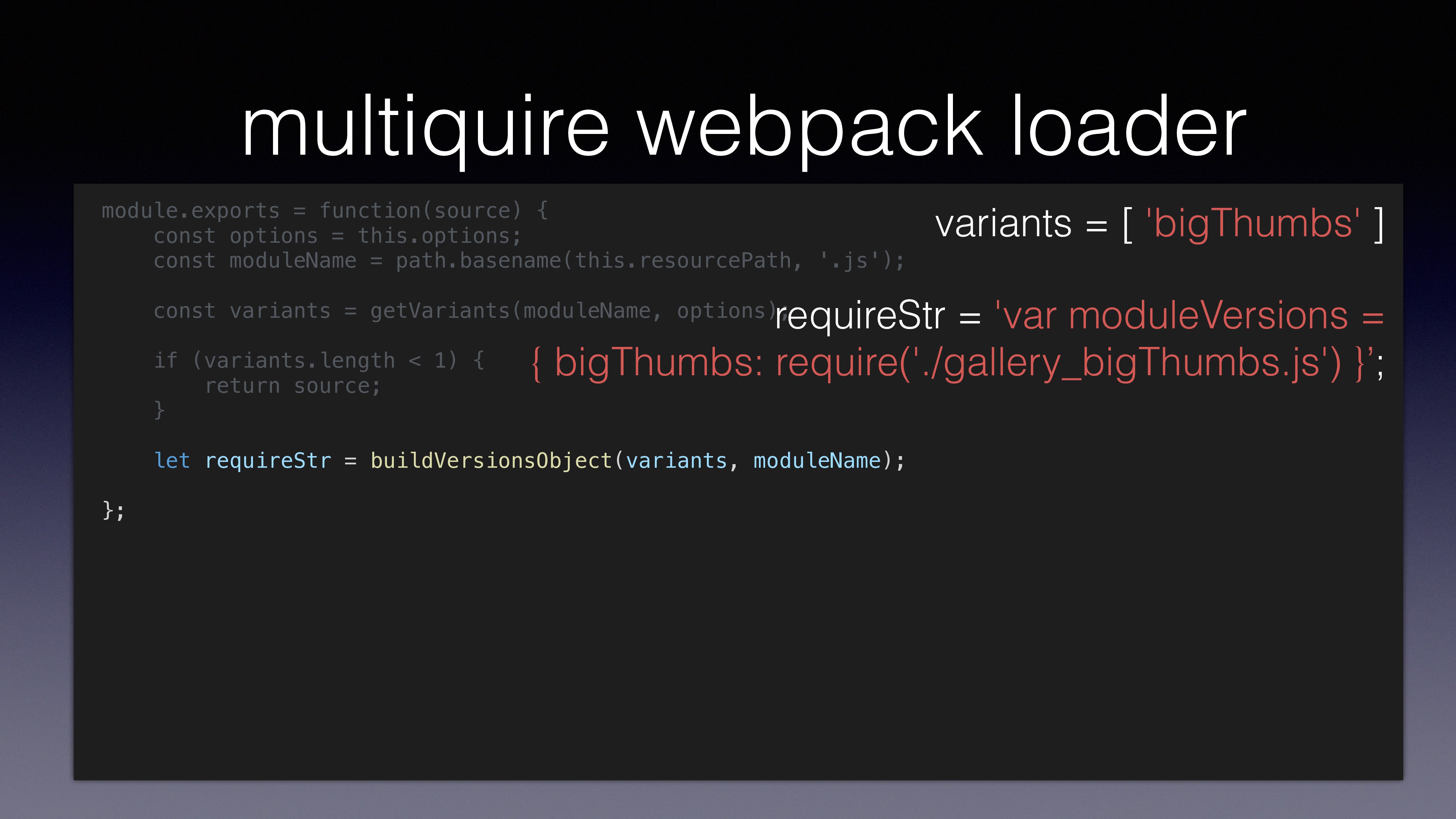 var gallery = multiquire('./gallery.js'); using multirequire() loads ‘gallery.js’ to memory loads both ‘gallery.js’ and ‘gallery_bigThumbs.js’ to memory