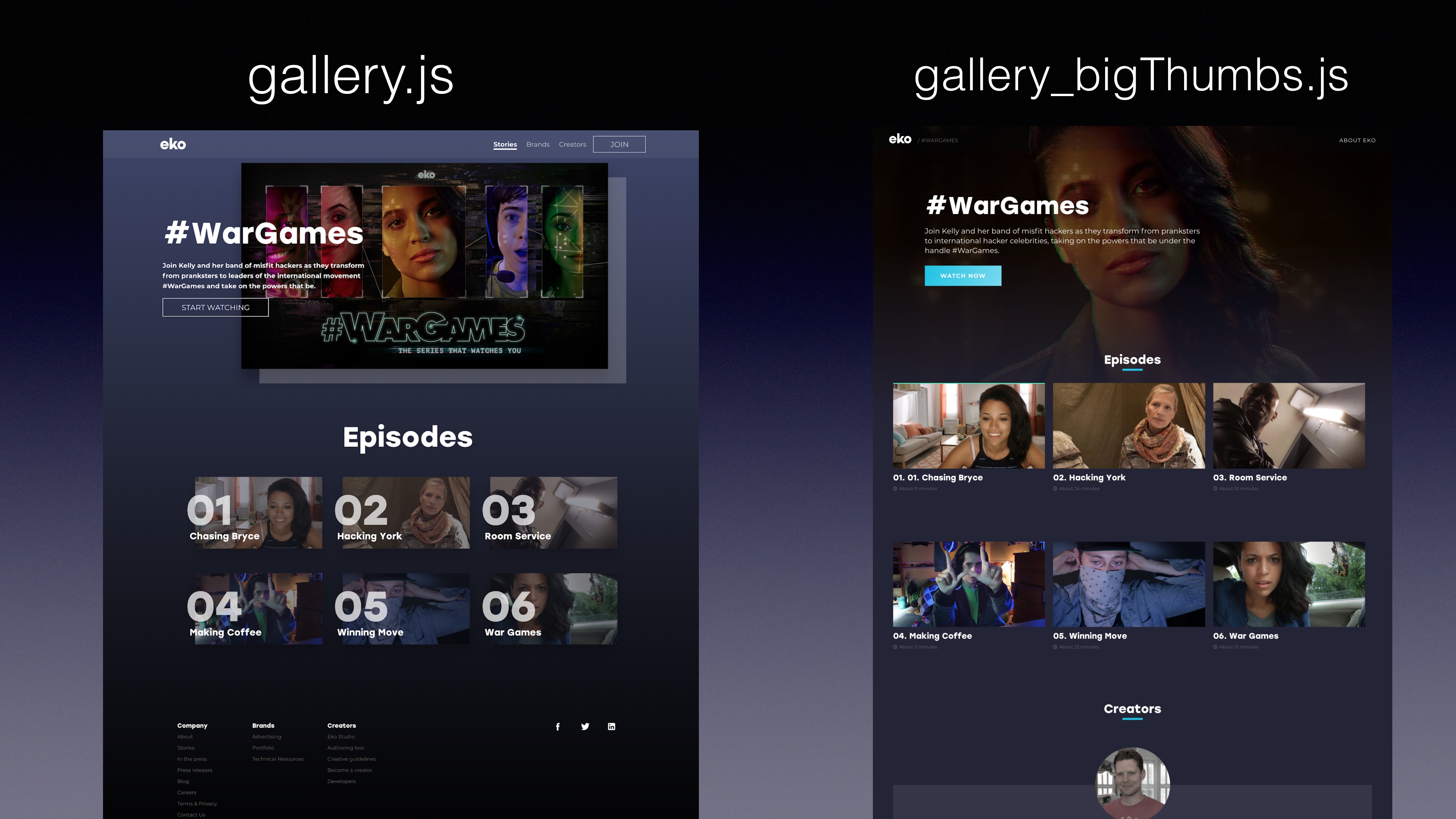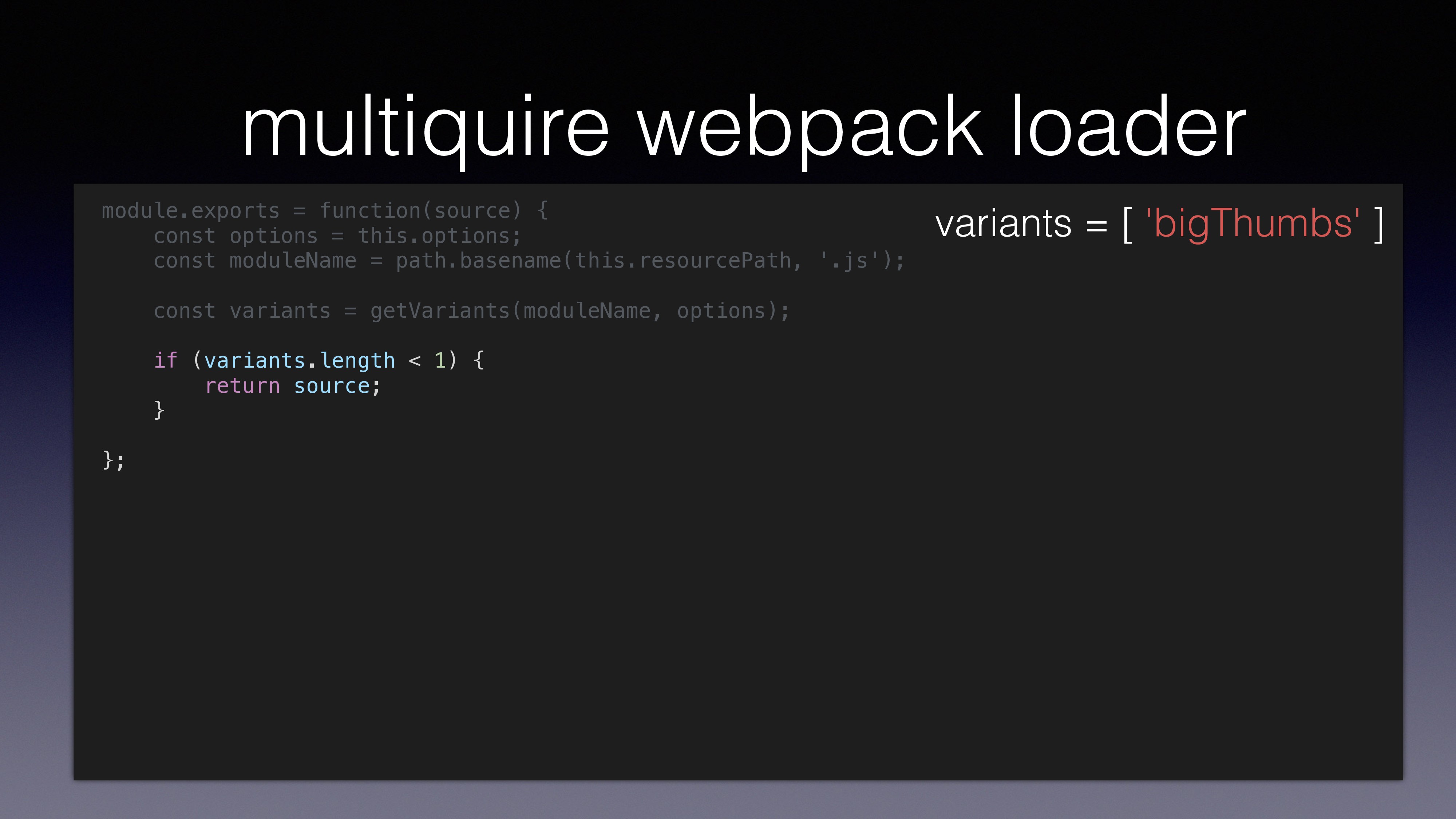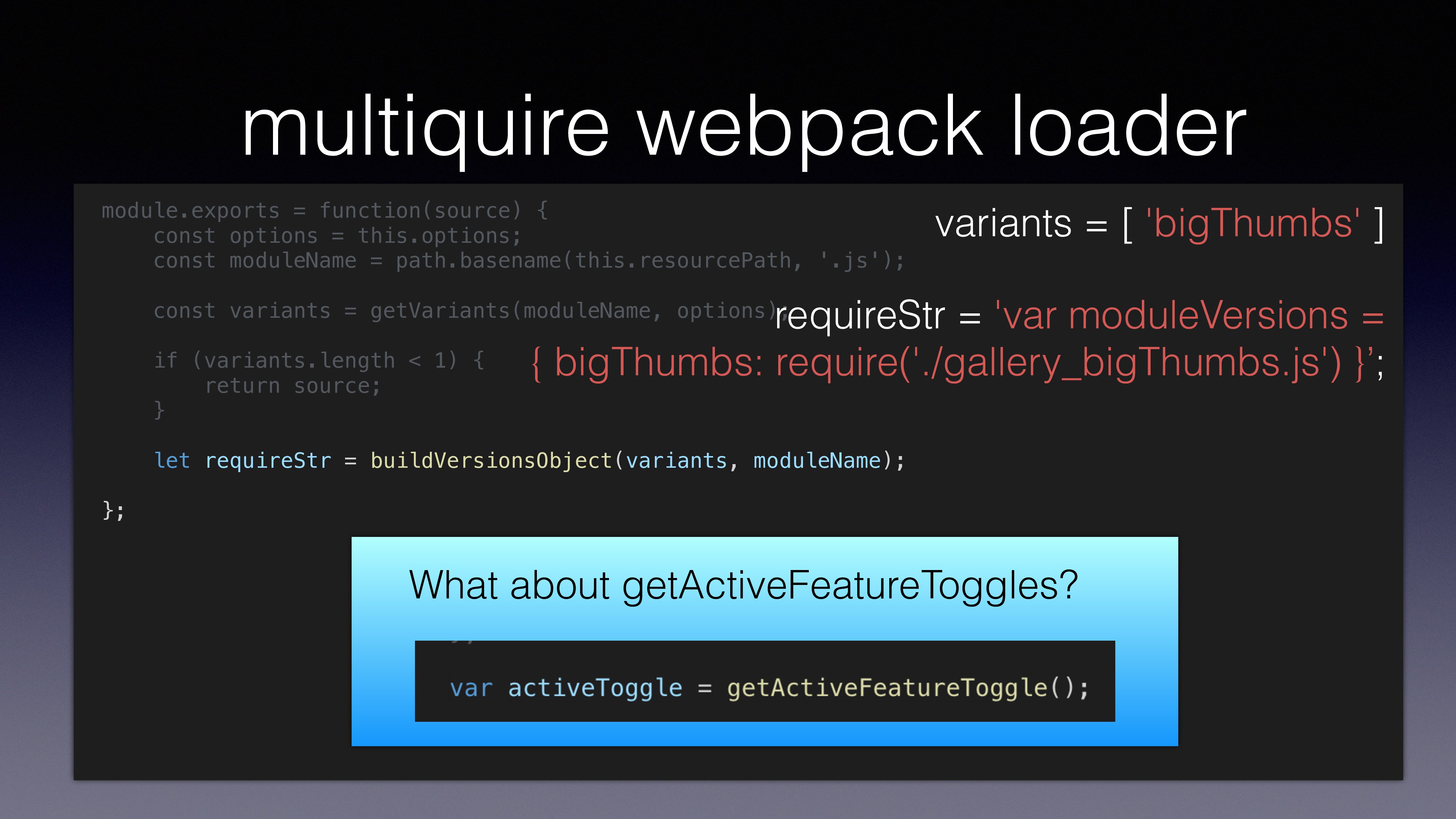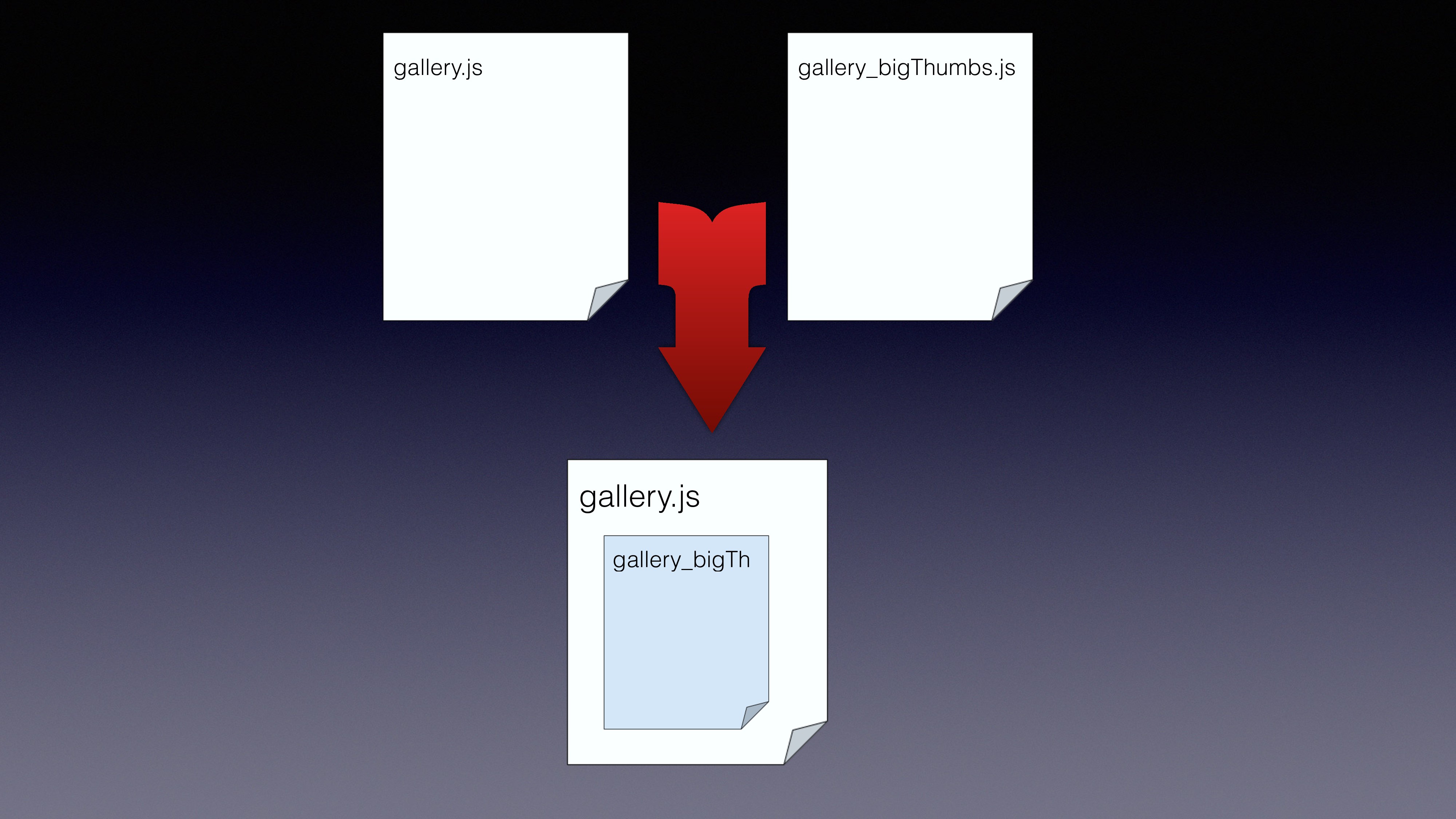 var gallery = multiquire('./gallery.js'); using multirequire() loads ‘gallery.js’ to memory loads both ‘gallery.js’ and ‘gallery_bigThumbs.js’ to memory