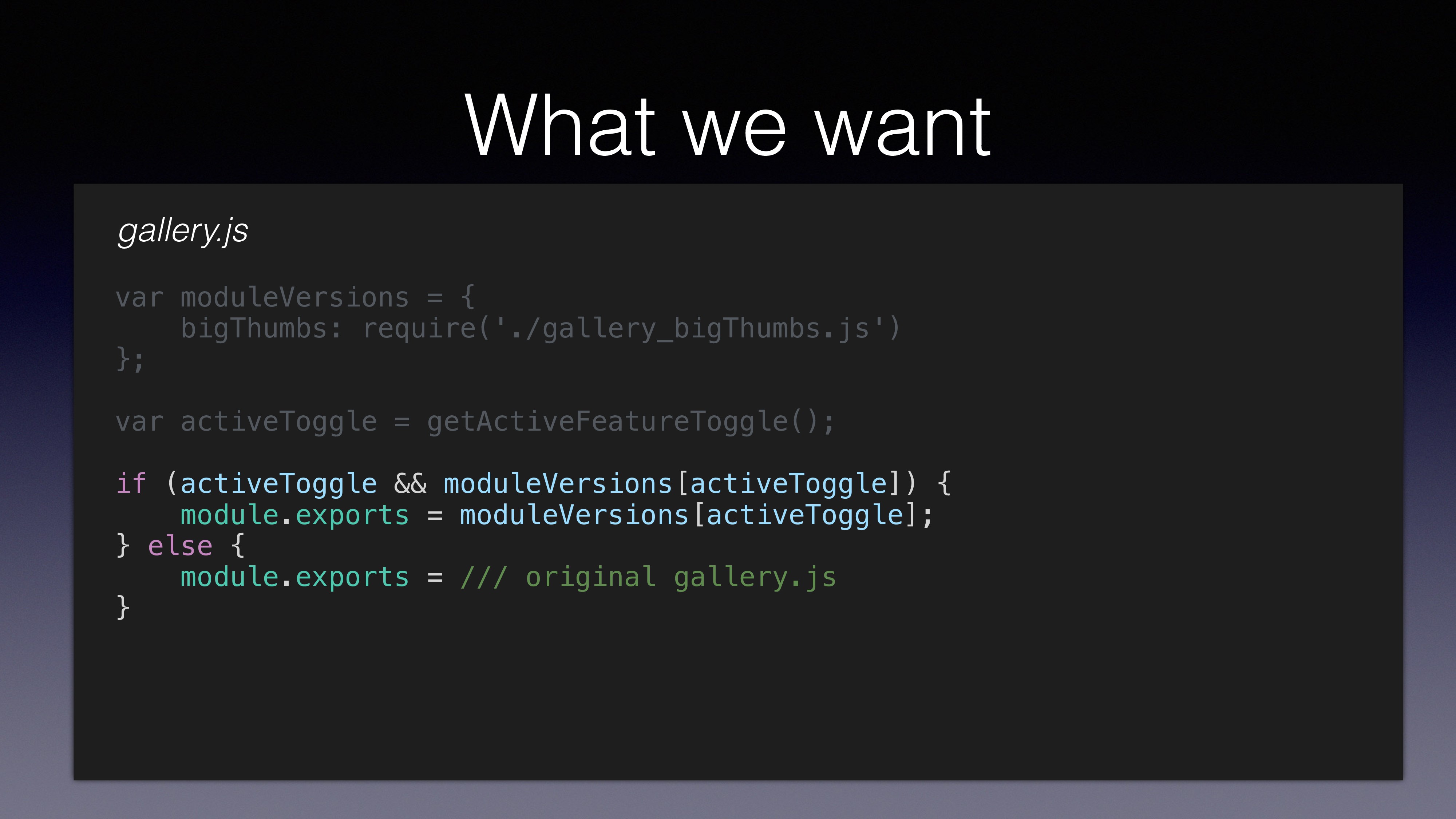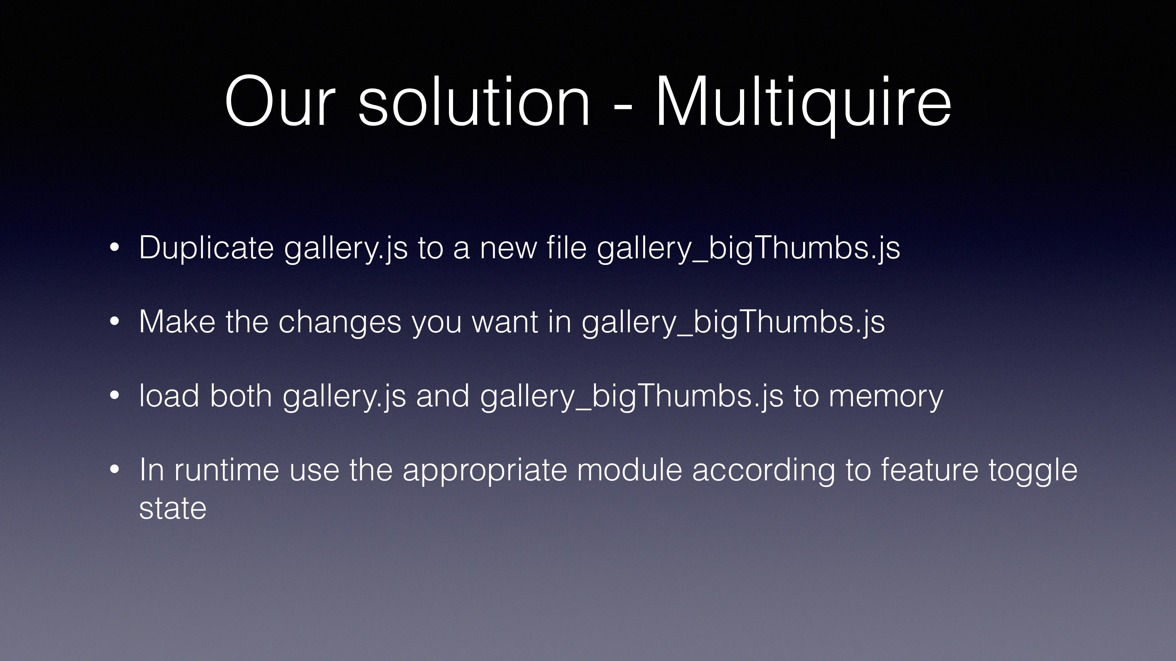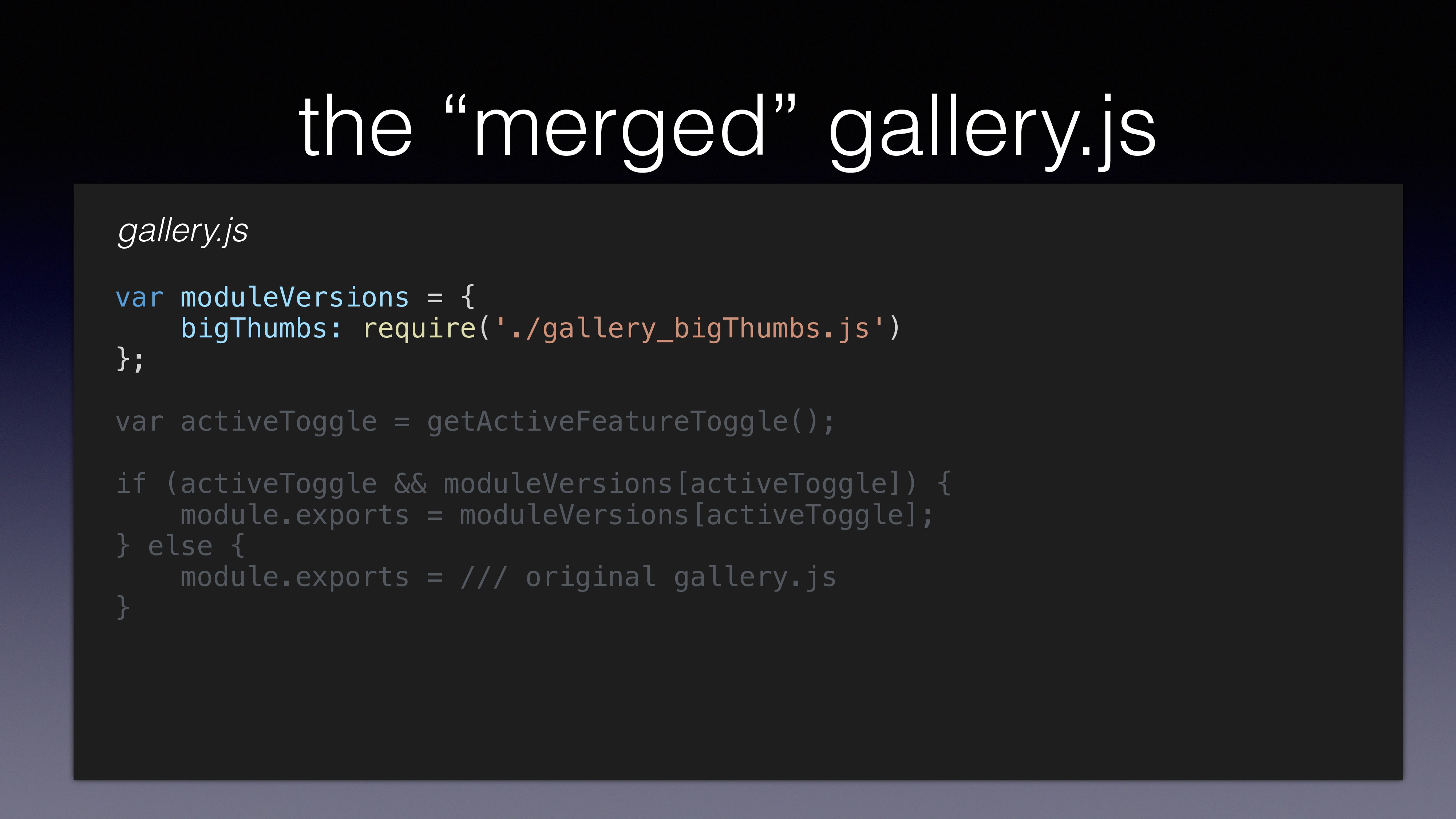 file gallery_bigThumbs.js • Make the changes you want in gallery_bigThumbs.js • load both gallery.js and gallery_bigThumbs.js to memory • In runtime use the appropriate module according to feature toggle state