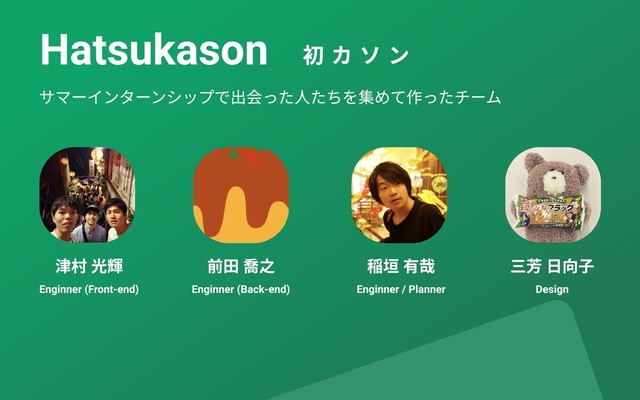 Enginner (Back-end) Enginner / Planner Design サマーインターンシップで出会った人たちを集めて作ったチーム Hatsukason 初 カ ソ ン