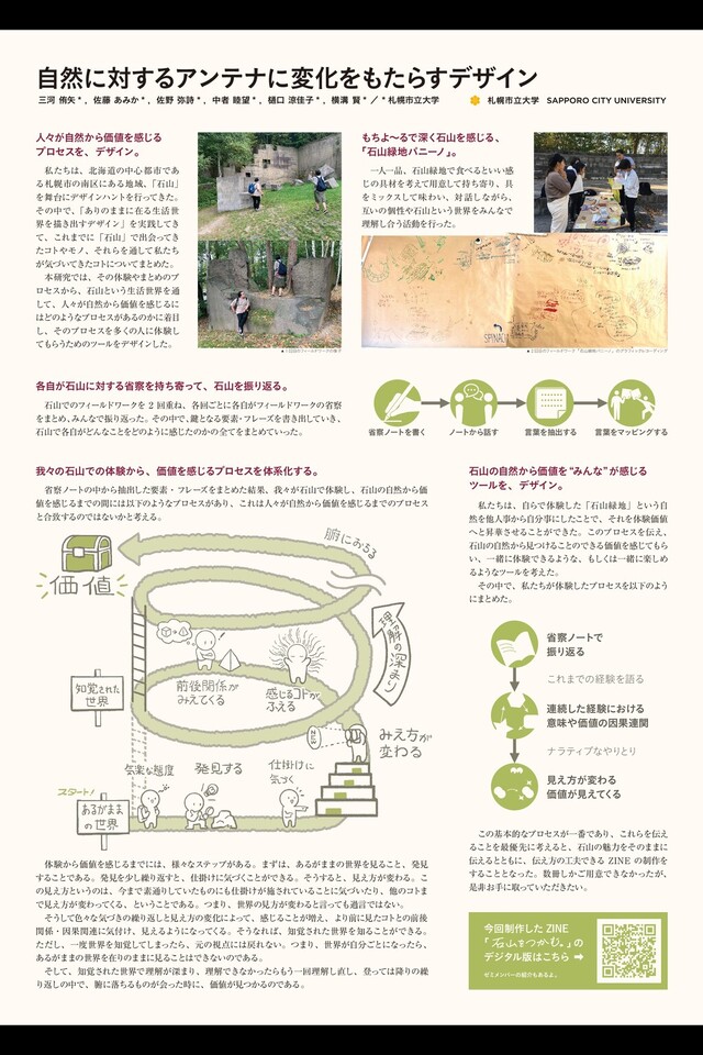 セッション: 石山緑地をフィールドとした生活世界を描く活動のデザインについての実践報告 スピーカー: 札幌市立大学デザイン学部 原初的デザインラボ(横溝研究室) 佐藤あみか、中者睦望