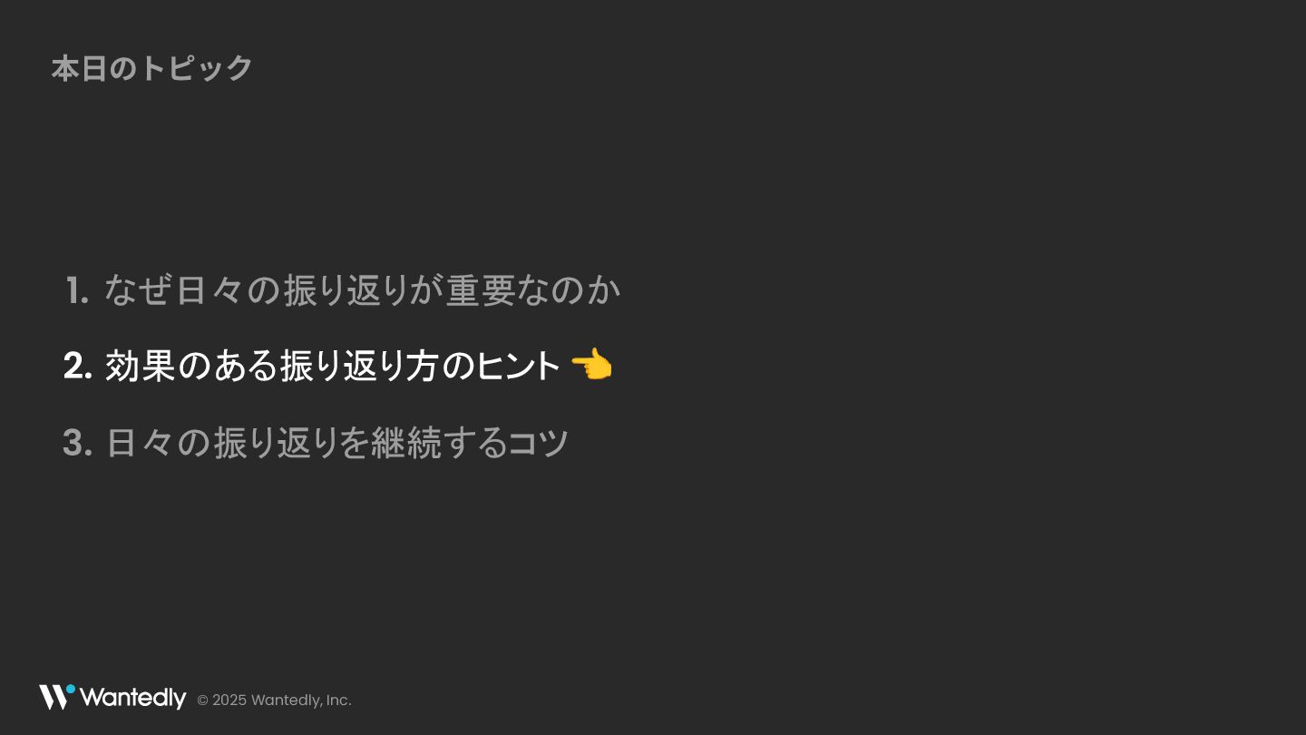 © 2025 Wantedly, Inc. 本⽇のトピック なぜ日々の振り返りが重要なのか 1. 効果のある振り返り方のヒント 👈 2.