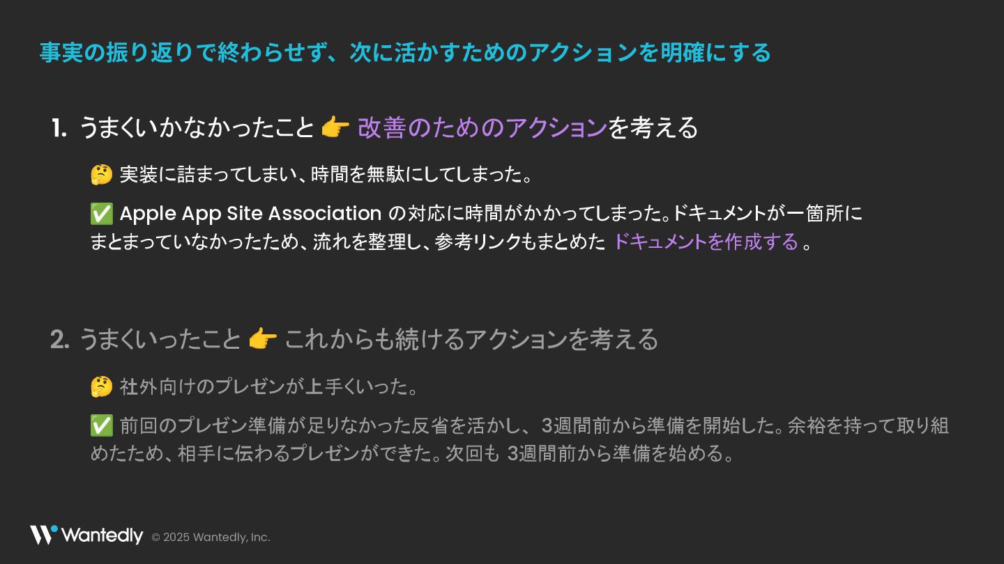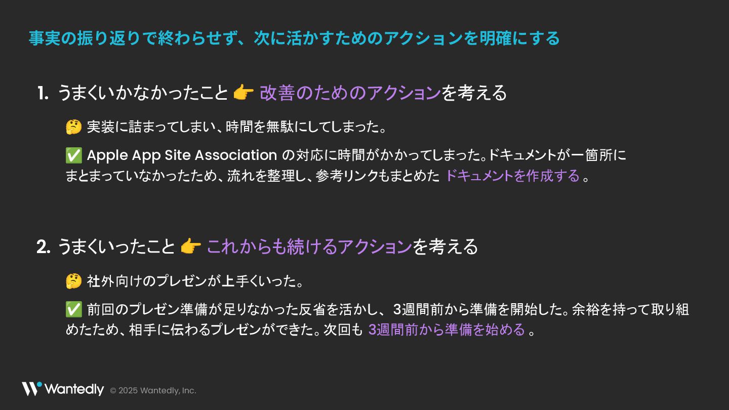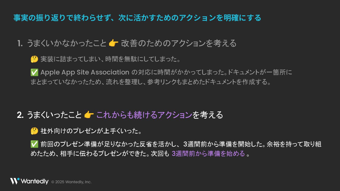 © 2025 Wantedly, Inc. 事実の振り返りで終わらせず、次に活かすためのアクションを明確にする うまくいかなかったこと 👉 改善のためのアクションを考える 🤔 実装に詰まってしまい、時間を無駄にしてしまった。