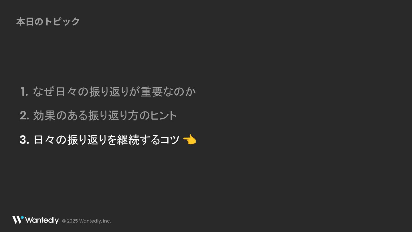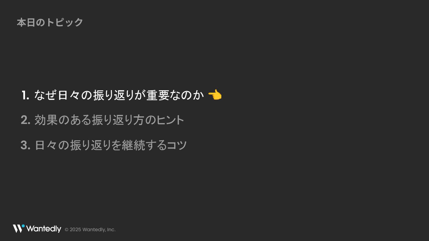 © 2025 Wantedly, Inc. 本⽇のトピック なぜ日々の振り返りが重要なのか 👈 1. 効果のある振り返り方のヒント 2.