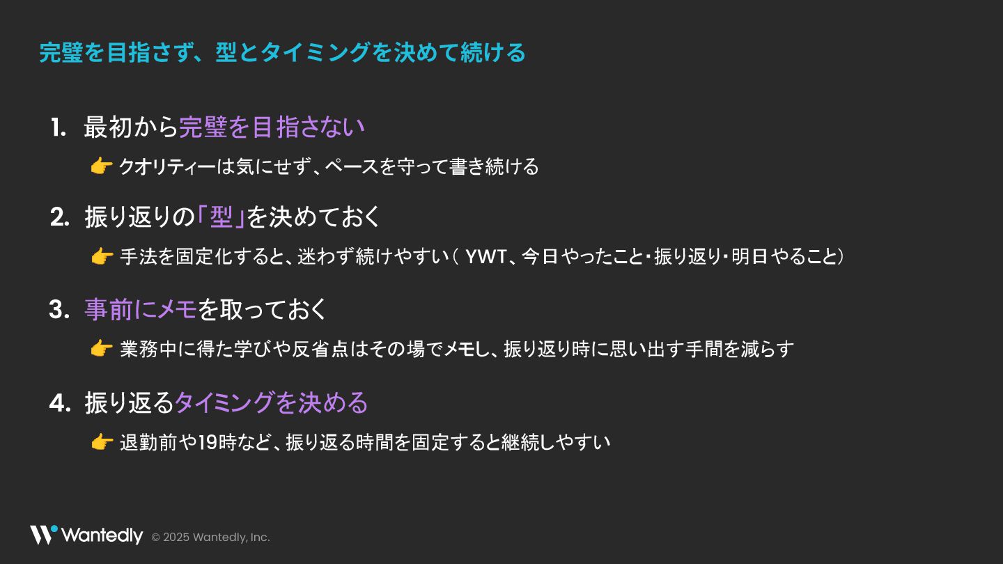 © 2025 Wantedly, Inc. 最初から完璧を目指さない 👉 クオリティーは気にせず、ペースを守って書き続ける 1. 完璧を⽬指さず、型とタイミングを決めて続ける 振り返りの「型」を決めておく