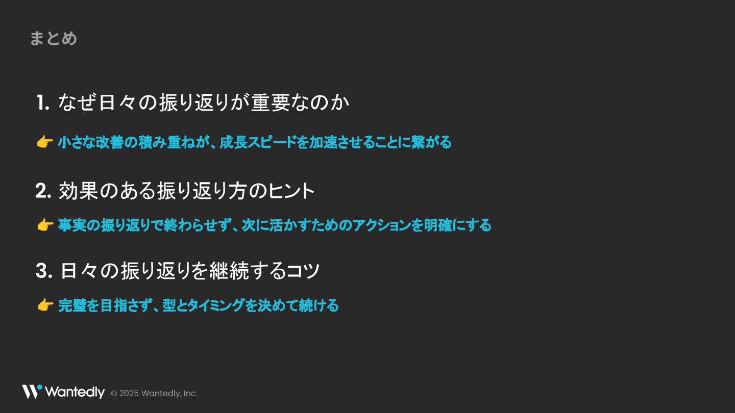 © 2025 Wantedly, Inc. なぜ日々の振り返りが重要なのか 1. 効果のある振り返り方のヒント 2. まとめ 👉