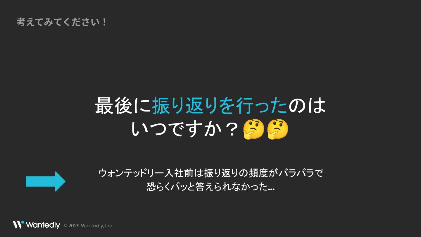 © 2025 Wantedly, Inc. 最後に振り返りを行ったのは いつですか?🤔🤔 考えてみてください! ウォンテッドリー入社前は振り返りの頻度がバラバラで 恐らくパッと答えられなかった…