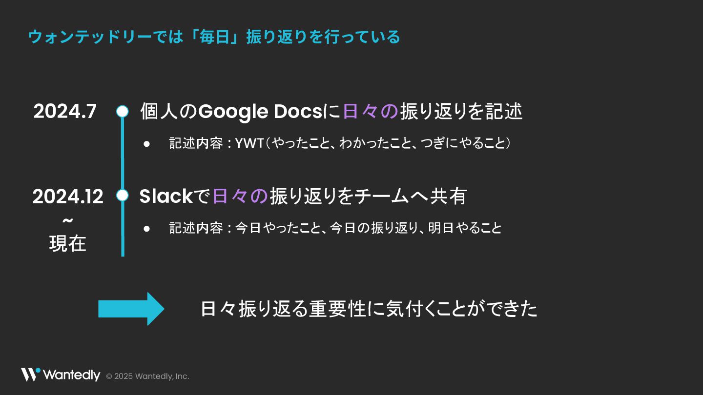 © 2025 Wantedly, Inc. ウォンテッドリーでは「毎⽇」振り返りを⾏っている 個人のGoogle Docsに日々の振り返りを記述 • 記述内容 :