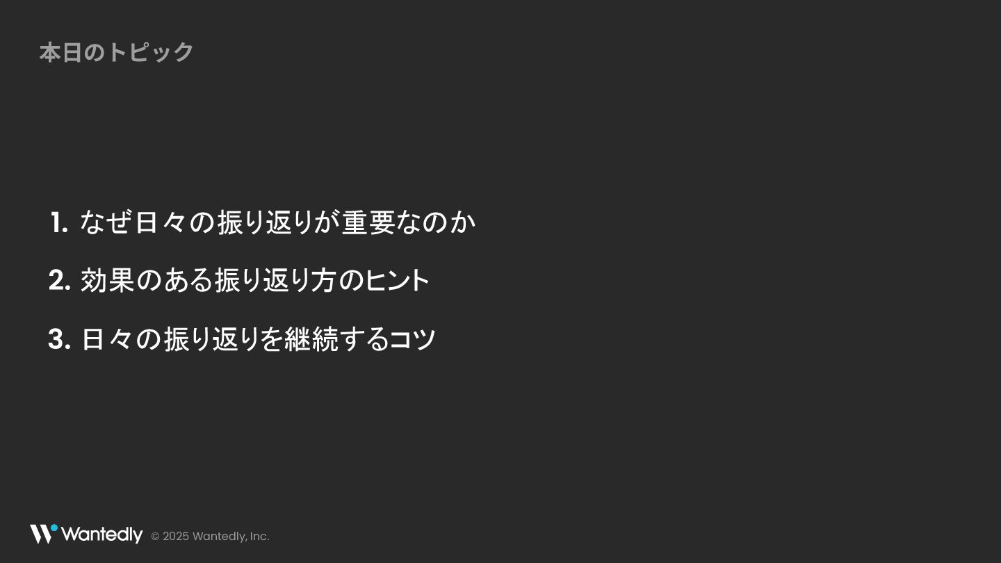 © 2025 Wantedly, Inc. 本⽇のトピック なぜ日々の振り返りが重要なのか 1. 効果のある振り返り方のヒント 2. 日々の振り返りを継続するコツ