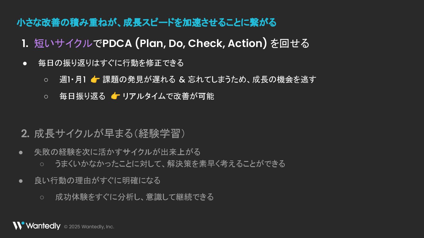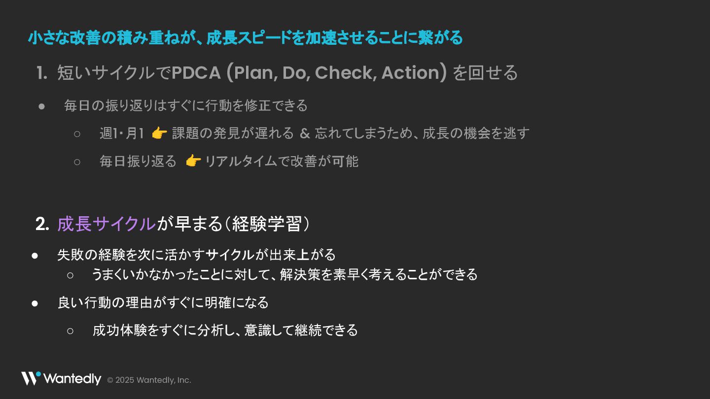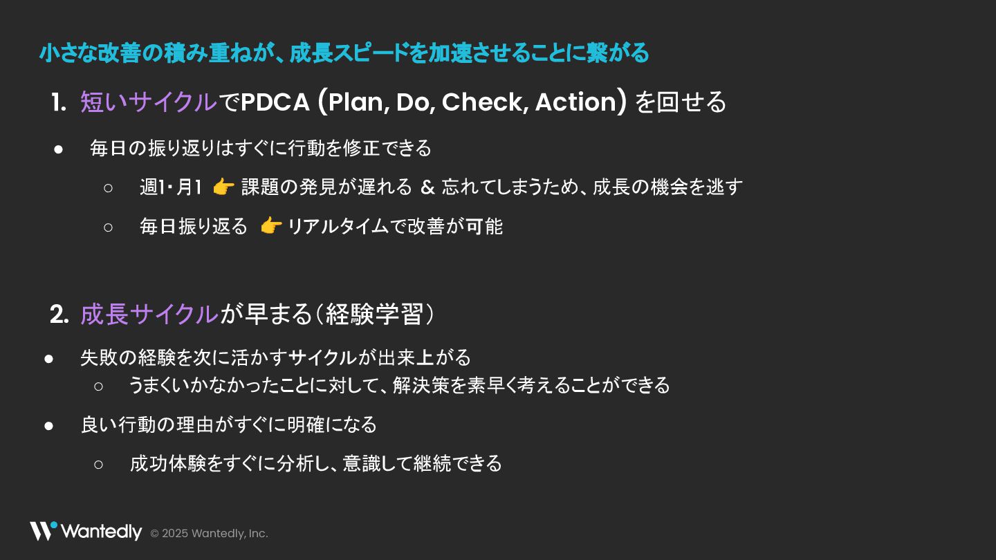 & 忘れてしまうため、成長の機会を逃す ◦ 毎日振り返る 👉 リアルタイムで改善が可能 短いサイクルでPDCA (Plan, Do, Check, Action) を回せる 1. 成長サイクルが早まる(経験学習) • 失敗の経験を次に活かすサイクルが出来上がる ◦ うまくいかなかったことに対して、解決策を素早く考えることができる • 良い行動の理由がすぐに明確になる ◦ 成功体験をすぐに分析し、意識して継続できる 2. 小さな改善の積み重ねが、成長スピードを加速させることに繋がる