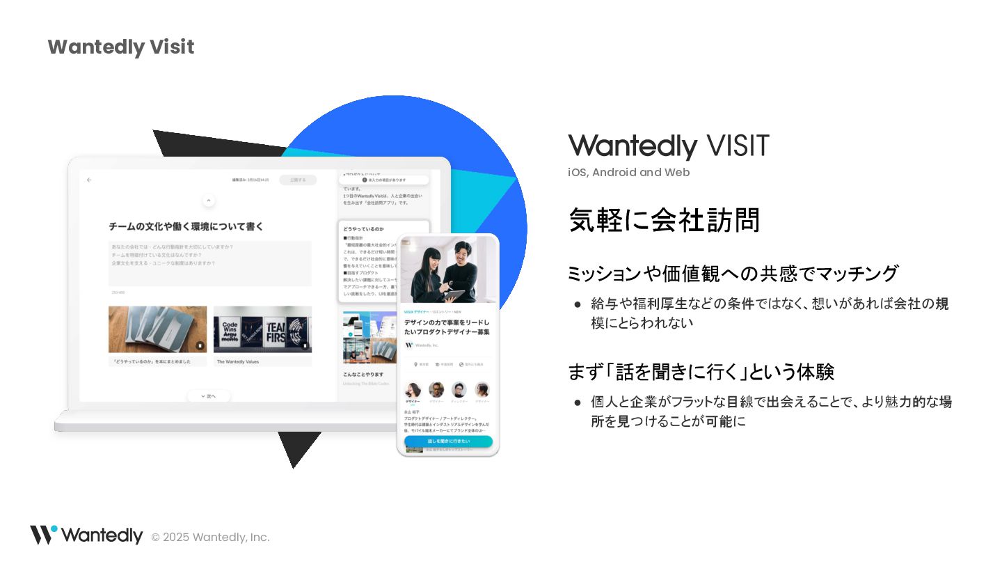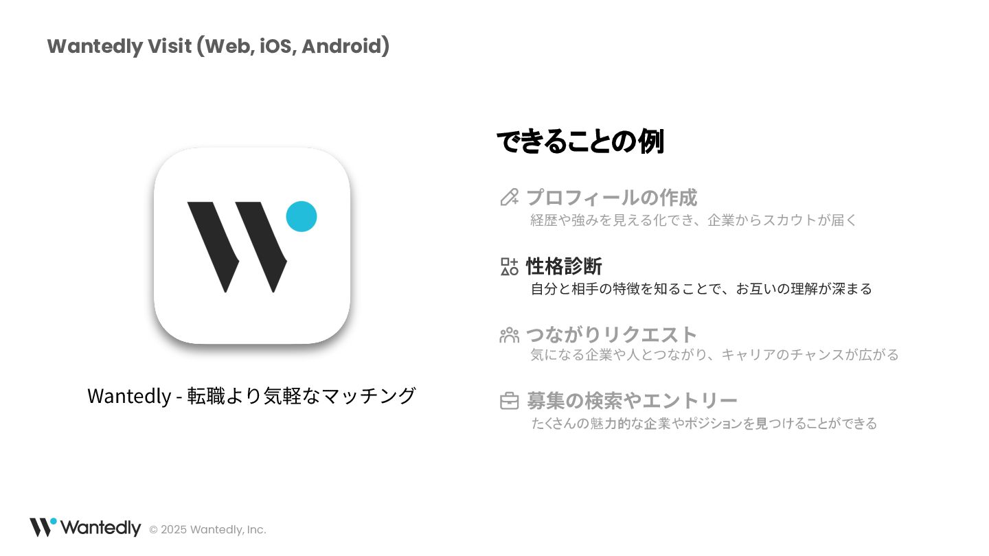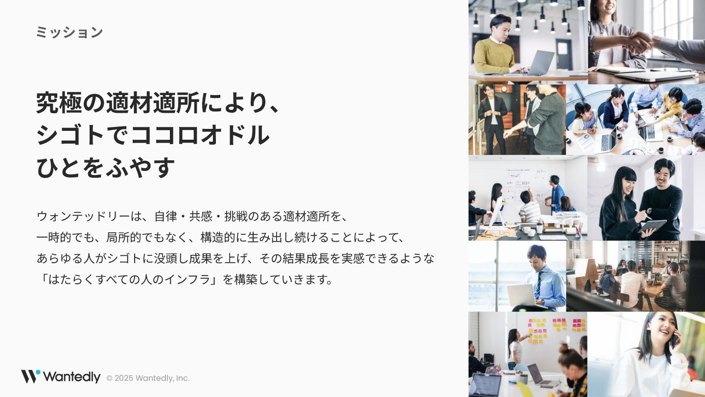 ウォンテッドリーは、「究極の適材適所によりシゴトでココロオドル人をふやす」をミッションとして、働く人全てに関わるプロダクトを開発しています。モバイルアプリは主にWantedlyアプリを展開し、求職者と企業の最適なマッチングを提供するサービスを提供しています 。