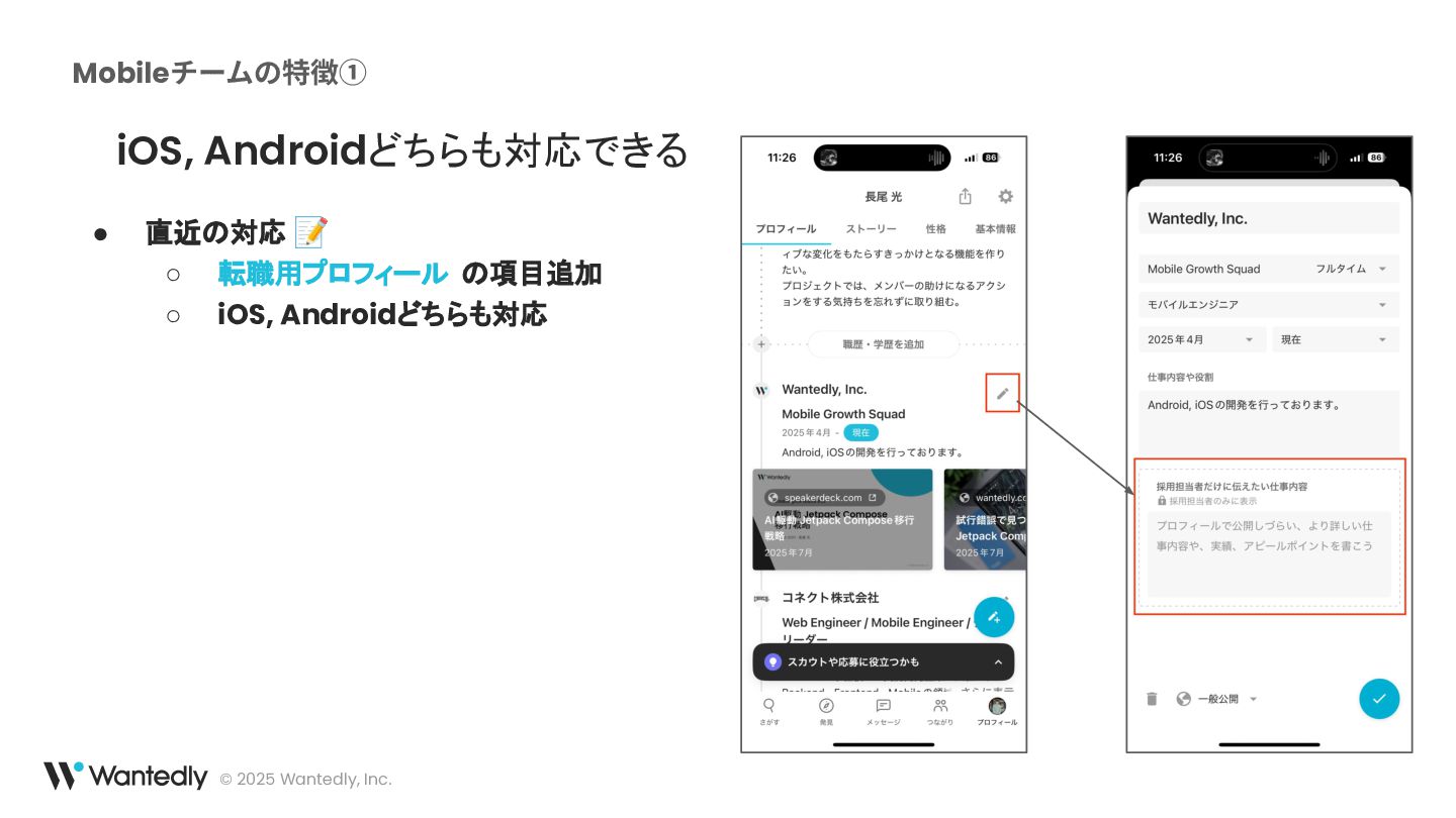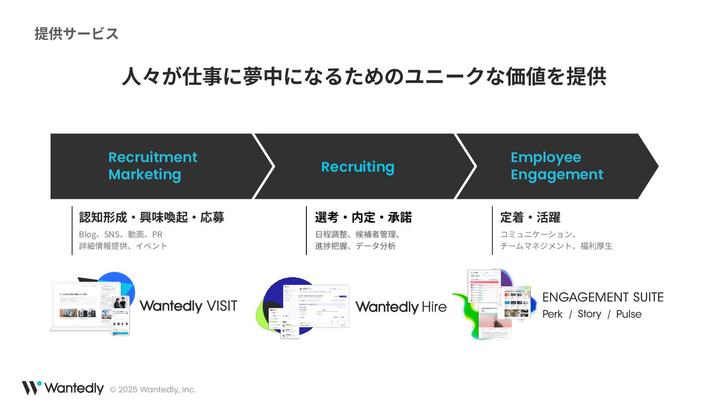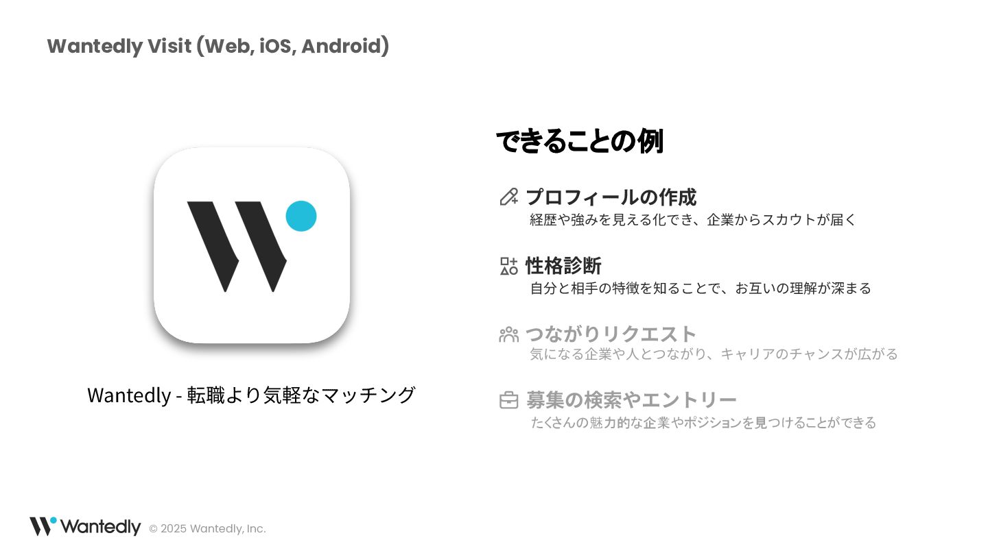 ウォンテッドリーは、「究極の適材適所によりシゴトでココロオドル人をふやす」をミッションとして、働く人全てに関わるプロダクトを開発しています。モバイルアプリは主にWantedlyアプリを展開し、求職者と企業の最適なマッチングを提供するサービスを提供しています 。