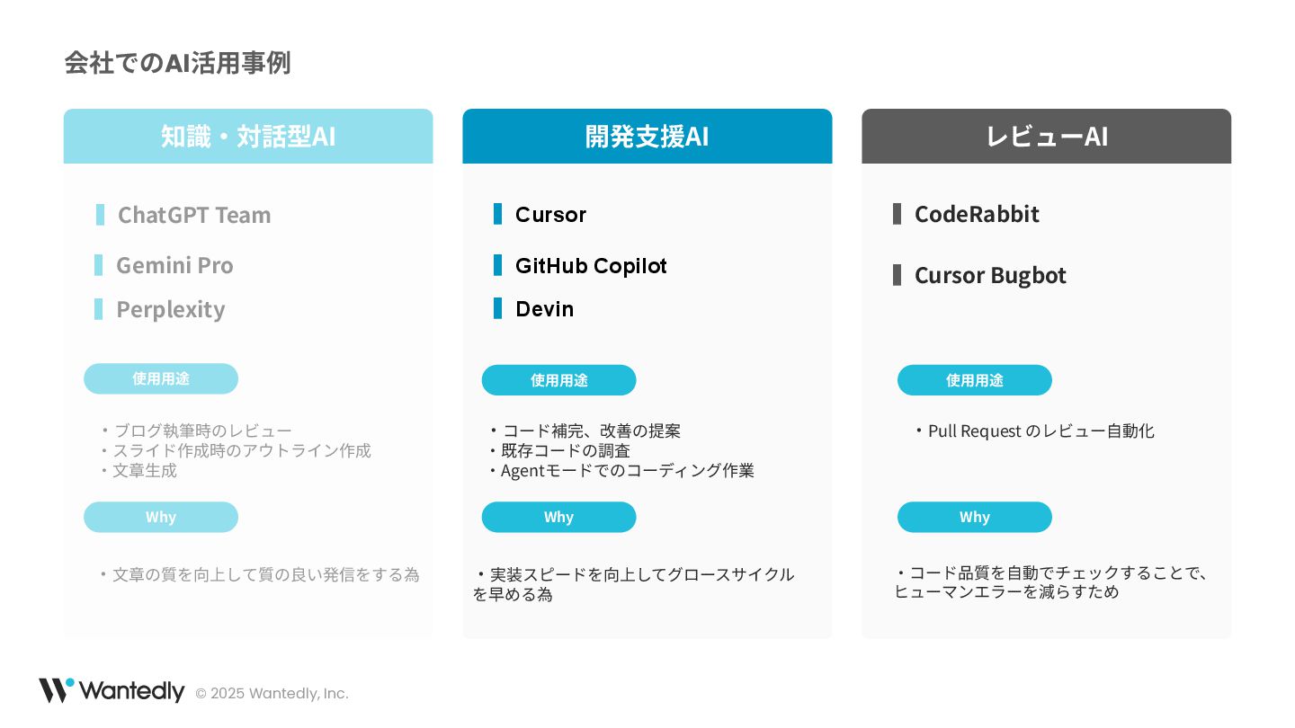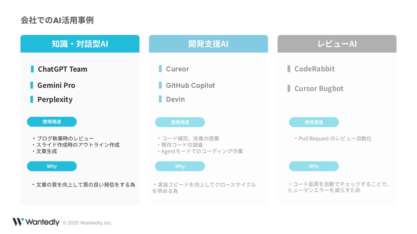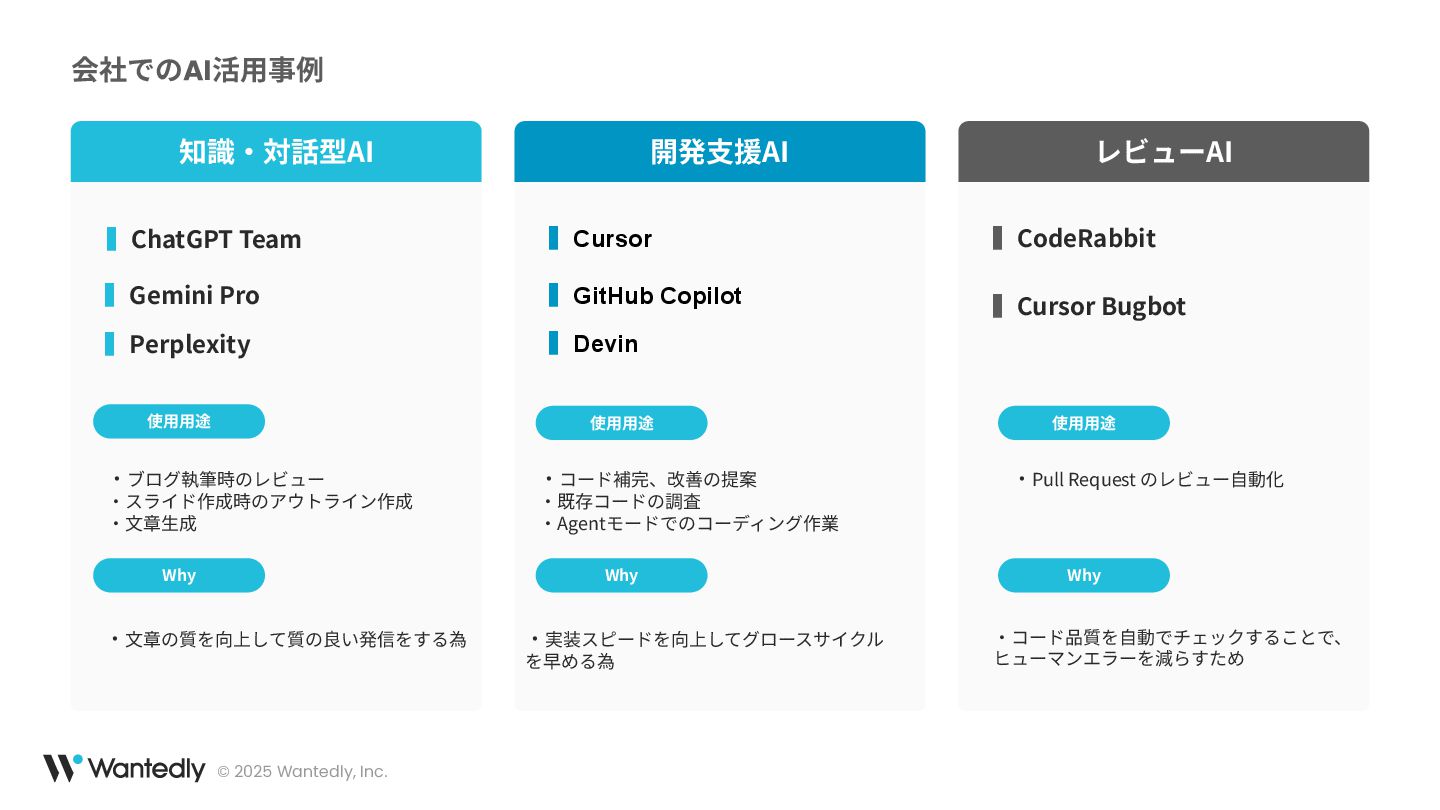 本セッションでは、弊社の開発現場におけるAIの活用状況についてご紹介します。エンジニアリングチームでは、開発効率の向上を目指し、AIツールや手法を日々の業務に取り入れています。