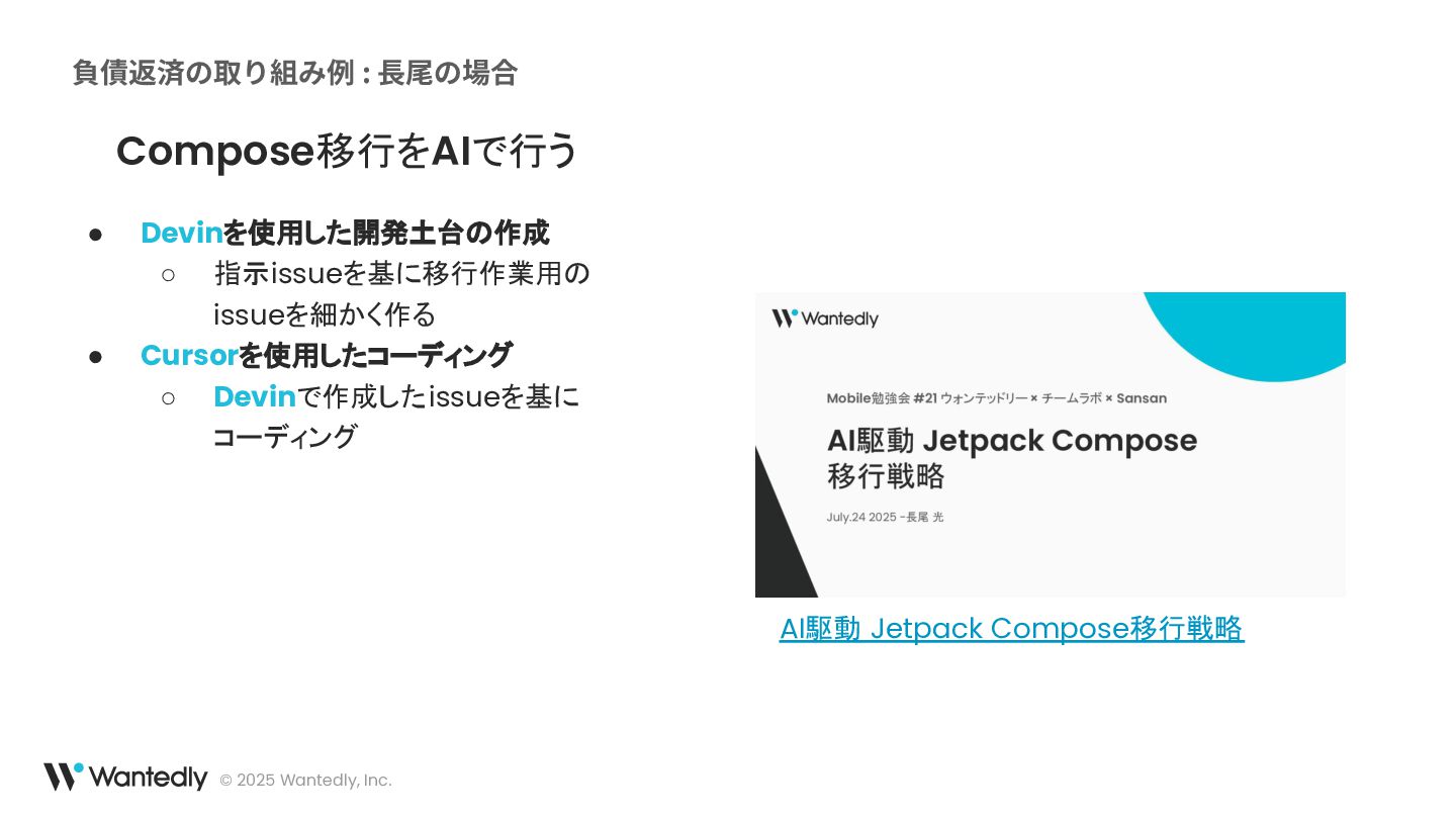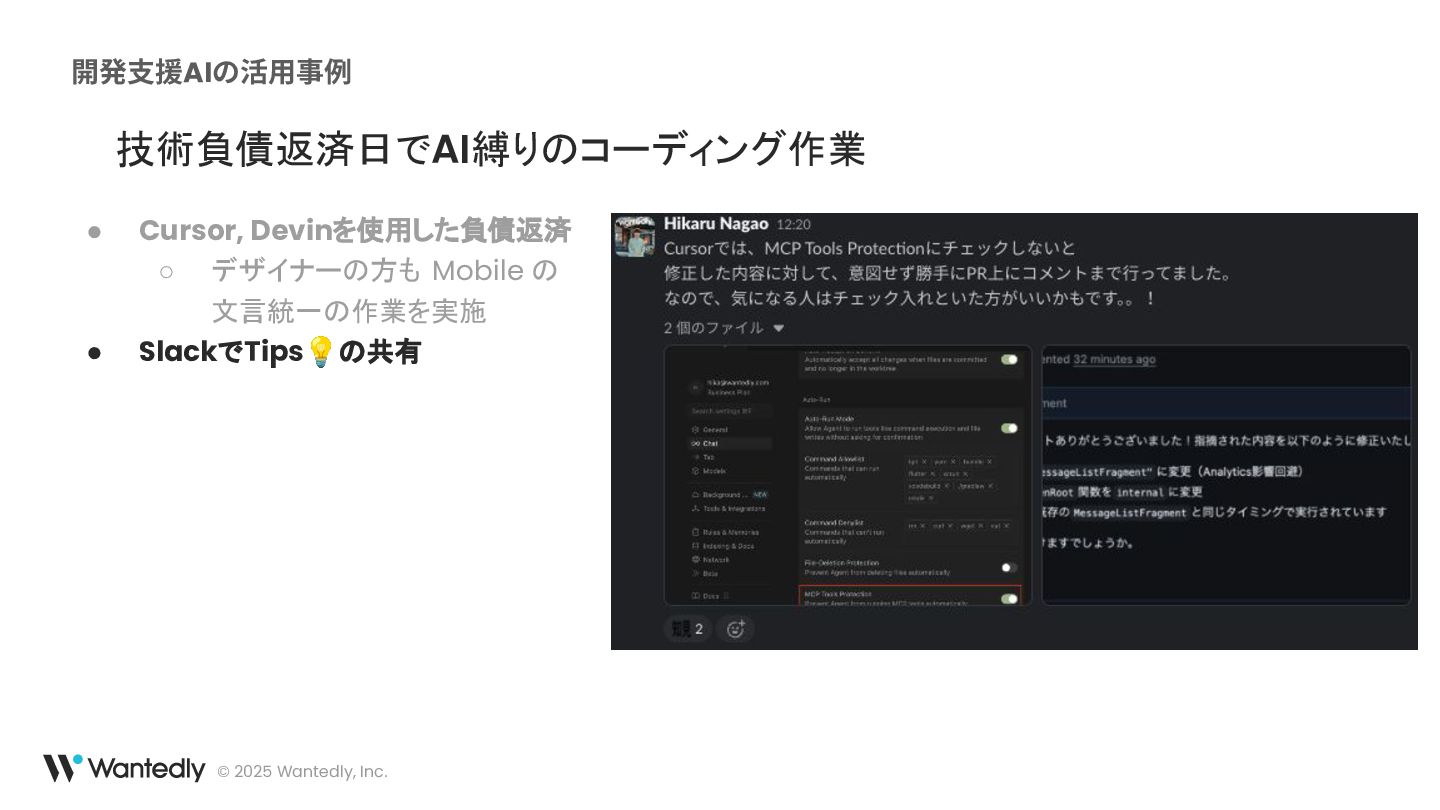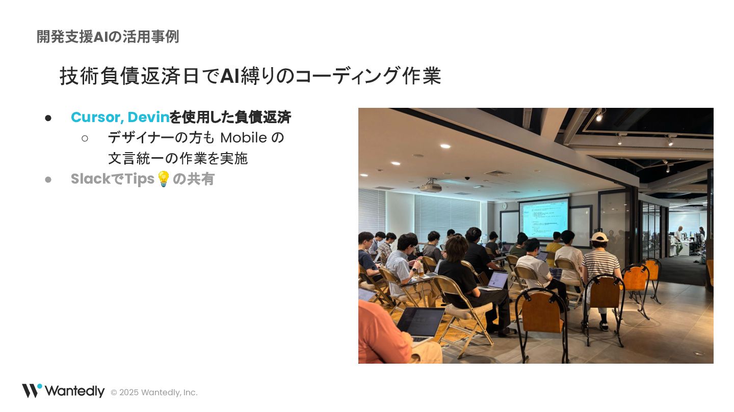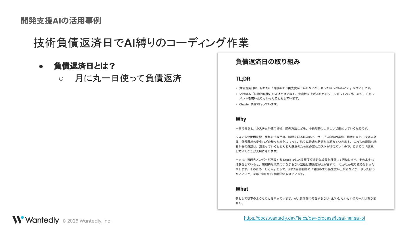 具体的には、コードの生成支援、レビュー補助、ドキュメント作成、さらには技術的負債の解消といった領域でAIを活用しています。これらの取り組みを通じて、AIが開発の様々な段階でどのようにエンジニアの業務を助け、プロセスを改善しているのか、その実態を概要レベルでお話しします。