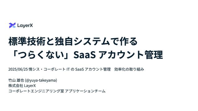 標準技術と独自システムで作る 「つらくない」SaaS アカウント管理 2025/06/25 情シス・コーポレート IT の SaaS アカウント管理 効率化の取り組み 竹山