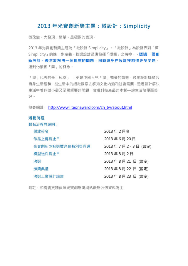 ,更是中國人見「微」知著的智慧,鼓勵設計師融合 自身生活經驗,從生活中的細微觀察去感知文化內涵和社會需要,透過設計解決 生活中看似微小卻又至關重要的問題,實現科技產品的本質—讓生活簡便而美 好。 競賽網址: http://www.liteonaward.com/zh_tw/about.html 活動時程 報名流程與說明: 開放報名 2013 年 2 月底 作品上傳截止日 2013 年 6 月 20 日 光寶創新獎初選暨光寶特別獎評選 2013 年 7 月 2、3 日 (暫定) 模型送件截止日 2013 年 8 月 2 日 決選 2013 年 8 月 21 日 (暫定) 頒獎典禮 2013 年 8 月 22 日 (暫定) 決選工業設計論壇 2013 年 8 月 23 日 (暫定) 附註:如有變更請依照光寶創新獎網站最新公佈資料為主
