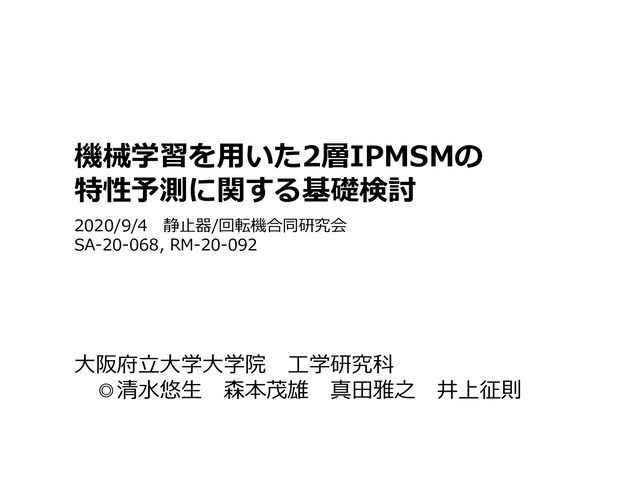 cos 𝛽 + 1 2 𝐿𝑞 − 𝐿𝑑 𝐼 𝑎 2 sin 2𝛽 𝑁 𝑙𝑖𝑚 = 𝑉 𝑎𝑚 − 𝑅𝑎 𝐼𝑎 𝛹 𝑎 − 𝐿𝑑 𝐼𝑎 sin 𝛽 2 + 𝐿𝑞 𝐼𝑎 cos 𝛽 2 ✓ N-T特性を予測するため,各電流ベクトル条件における モータパラメータを学習する N-T特性 ロータ形状 学習 算出 N T モータパラメータ L d, L q β I a Ψ a I a 永久磁石による 電機子鎖交磁束 d,q軸インダクタンス 𝛹 𝑎 = 𝑓 𝐼 𝑎 , 𝐱 geom 𝐿 𝑑 = 𝑔 𝐼 𝑎 , 𝛽, 𝐱 geom 𝐿 𝑞 = ℎ 𝐼 𝑎 , 𝛽, 𝐱 geom ロータ形状,電流条件と パラメータの関係を学習 𝐼 𝑎 : 電機子電流 𝛽: 電流位相 𝐱 geom : 設計変数ベクトル 𝑃 𝑛 : 極対数 𝑅 𝑎 : 巻線抵抗 𝑉 𝑎𝑚 : 電機子電圧制限値