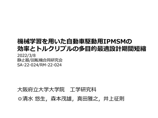 手法 最適化手法:NSGA-II 集団サイズ:50 子孫の数:10 終了条件:50世代で終了 予測誤差を考慮 した係数(=1.05) *重みベクトル *制約は要求運転点 を 予測トルク が上回ること ( ) ( ) 1 2 3 , , 1,1,1 w w w = ( ) ( ) ( ) , i i req req N T ( ) i pred T 選択:トーナメント法 交叉:Simulated Binary Crossover 突然変異:Polynomial Mutation 初期世代:ラテン超方格法により生成 速度 トルク 11000 min-1 40Nm 197Nm 3000 min-1 相電流制限134A 端子電圧制限507V 赤字:効率・リプル 評価点 青字:要求運転点 (T req ) 20Nm 3500 min-1 P 1 P 2 η 2 η 1 ,T ripple ( ) 1 2 1 2 3 1 2 : 3,4 min . . geom pred ripple init ripple j pred pred AD init init x pred req j j T j w w w P T s t g T T = − − + 適用範囲 制約 (1) Y. Shimizu, et al., IEEJ J. Ind. Appl., vol. 10, No. 5, pp. 554-563, 2021