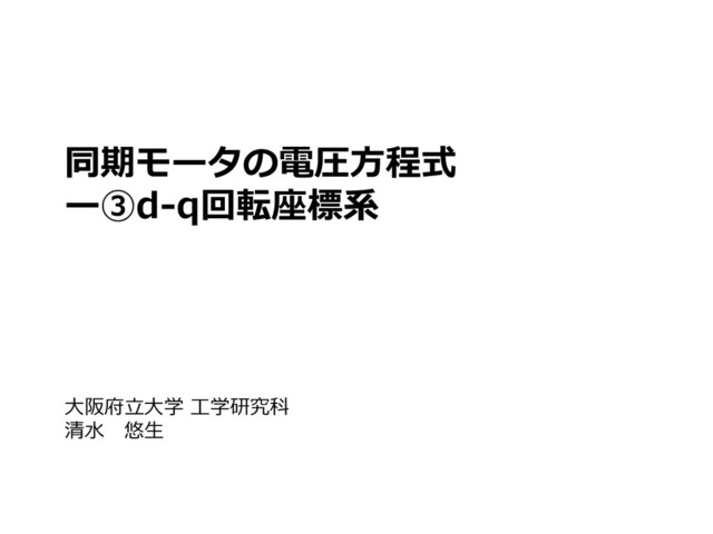 𝑑𝑡 𝑖𝑞 > 0 のときの非定常(過渡)状態では ベクトル図は下図のようになる 𝑣𝑑 𝑣𝑞 = 𝑅𝑎 𝑖𝑑 𝑖𝑞 + 𝐿𝑑 0 0 𝐿𝑞 𝑑 𝑑𝑡 𝑖𝑑 𝑖𝑞 + −𝜔𝐿𝑞 𝑖𝑞 𝜔𝐿𝑑 𝑖𝑑 + 𝜔𝛹𝑎 ⇔ 𝒗𝑎=𝑅𝑎 𝒊𝑎 + 𝑝𝑳𝑎 𝒊𝑎 + 𝒗𝑜 𝑝: 時間微分演算子 𝑳𝑎 : インダクタンス行列 Ya Yo Ld id Lq iq id iq ia vo va wLd id Ra ia d軸 q軸 鎖交磁束 電機子電流 電機子電圧 誘導起電力 電圧降下 wYa pLq iq pLd id 電流変化による 誘導起電力 wLq iq