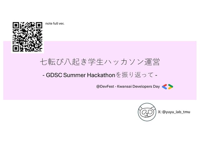七転び⼋起き学⽣ハッカソン運営 - GDSC Summer Hackathonを振り返って - X: @yuyu_lab_tmu @DevFest -