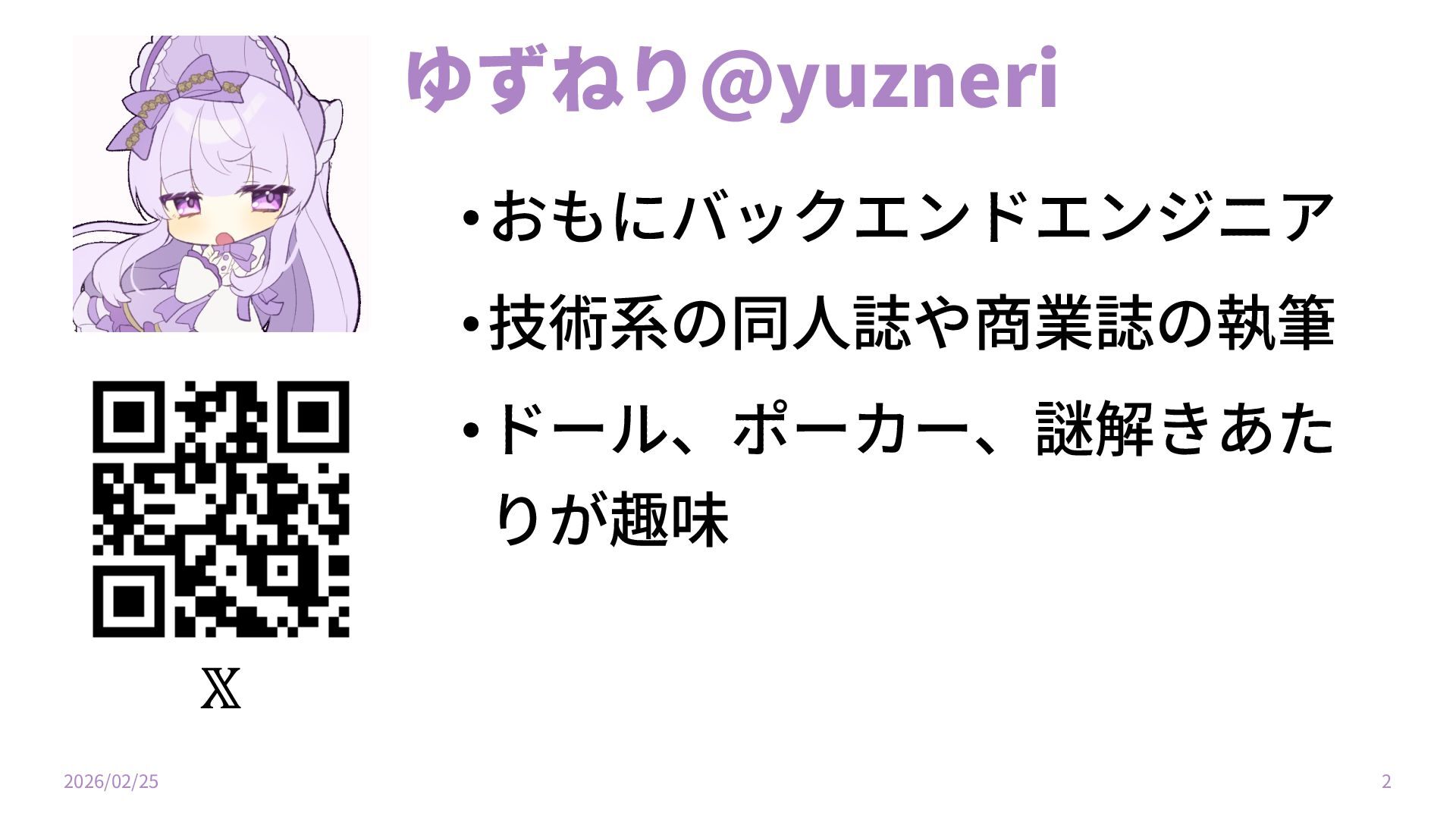 ゆずねり@yuzneri •おもにバックエンドエンジニア •技術系の同⼈誌や商業誌の執筆 •ドール、ポーカー、謎解きあた りが趣味 2026/02/25 2 𝕏