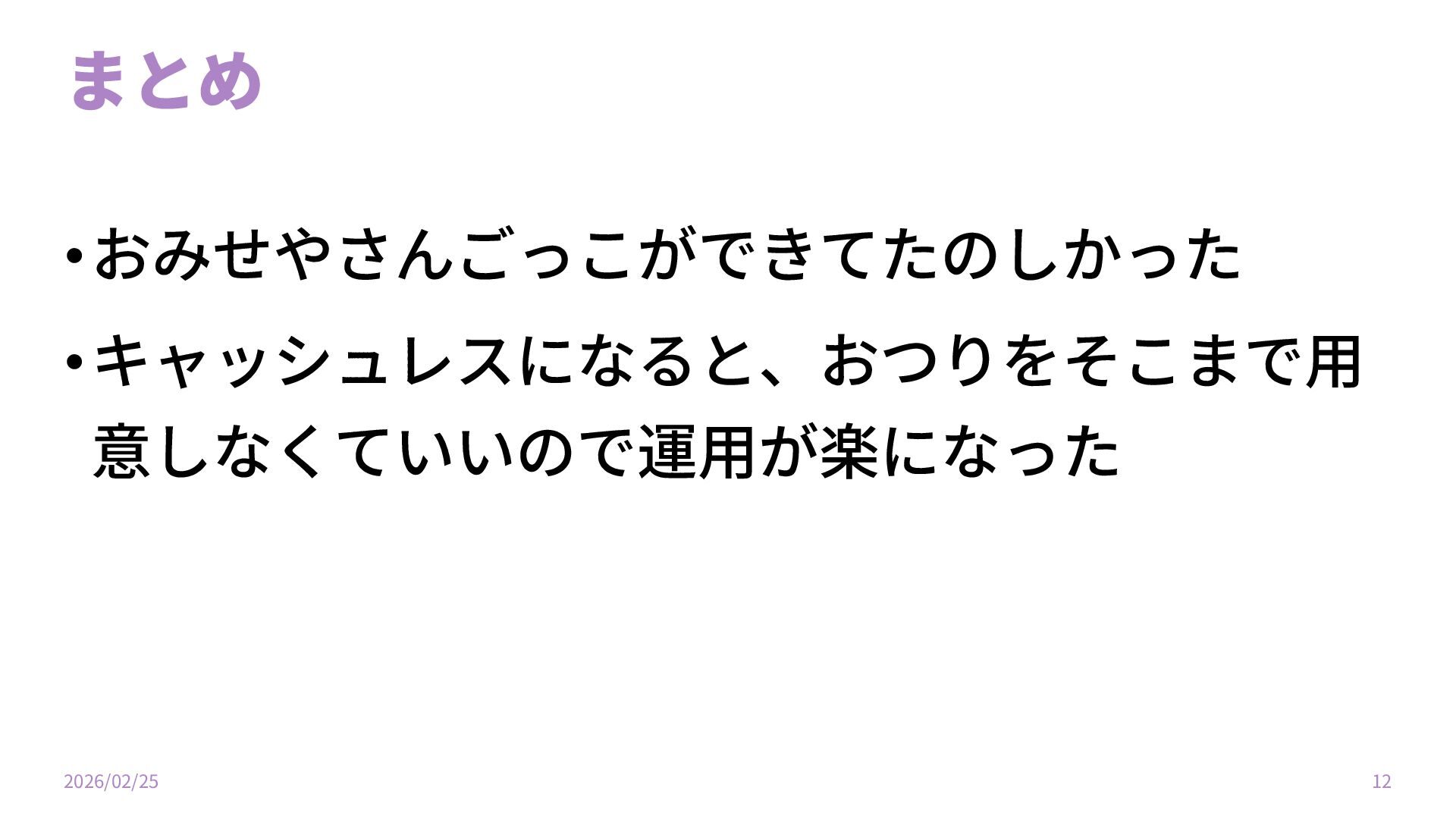 まとめ •おみせやさんごっこができてたのしかった •キャッシュレスになると、おつりをそこまで⽤ 意しなくていいので運⽤が楽になった 2026/02/25 12