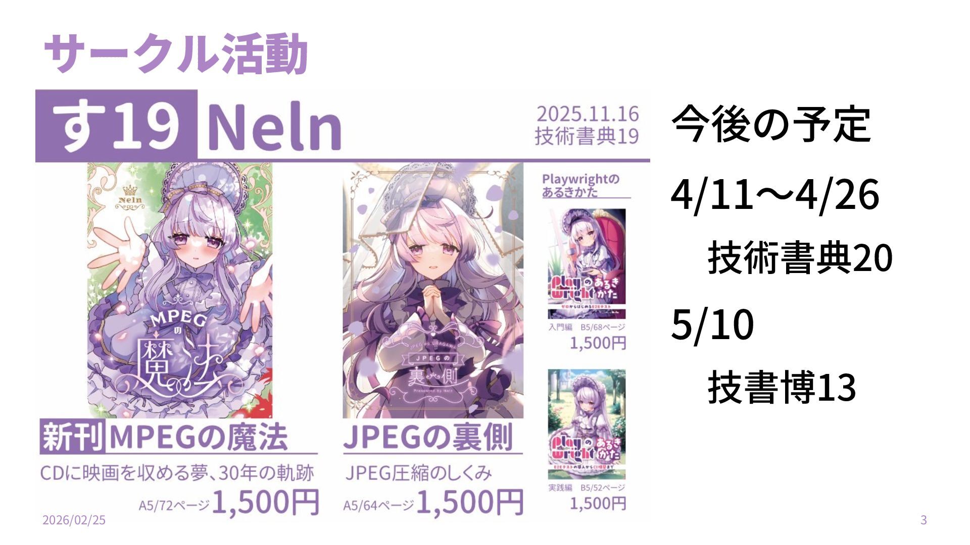 サークル活動 今後の予定 4/11〜4/26 技術書典20 5/10 技書博13 2026/02/25 3