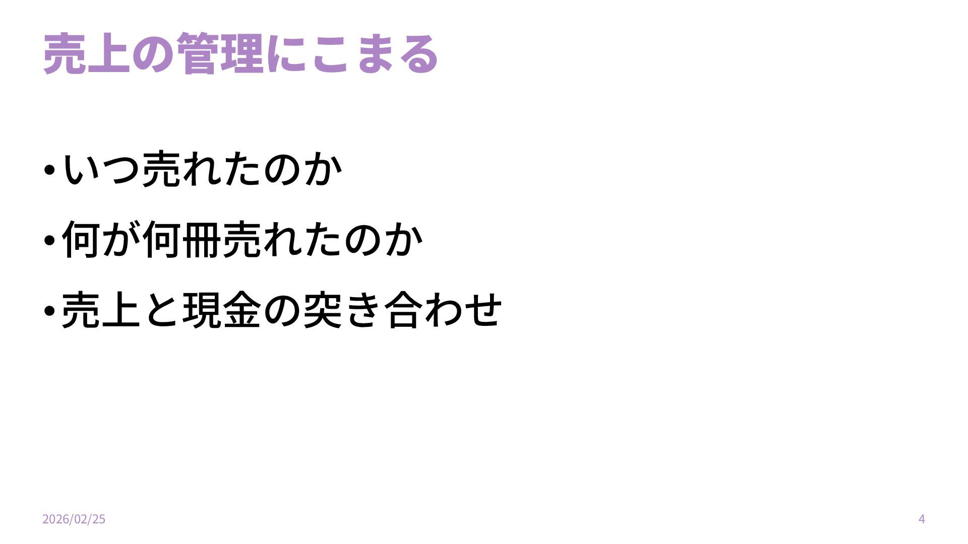 売上の管理にこまる •いつ売れたのか •何が何冊売れたのか •売上と現⾦の突き合わせ 2026/02/25 4