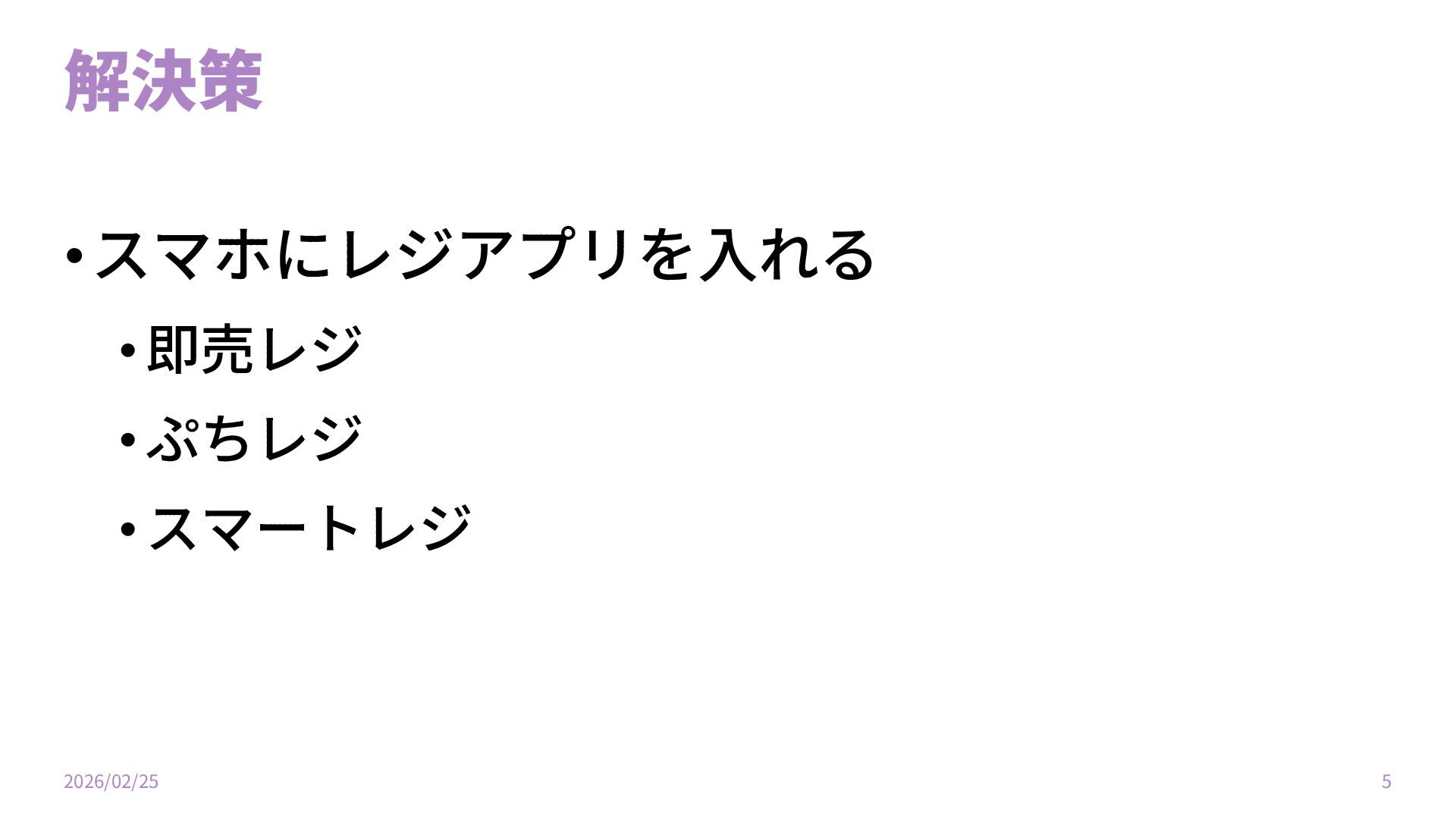 解決策 •スマホにレジアプリを⼊れる •即売レジ •ぷちレジ •スマートレジ 2026/02/25 5