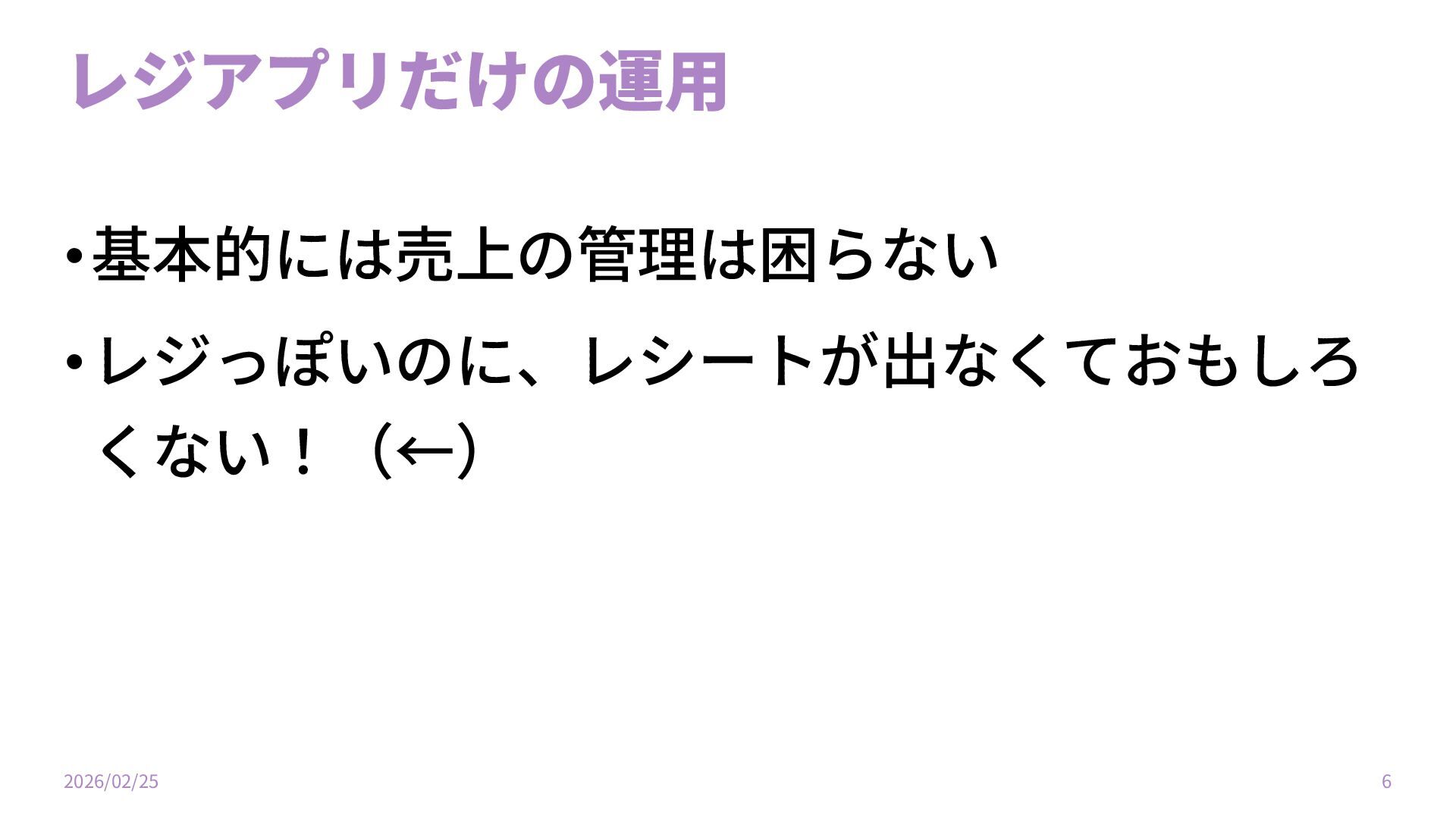 レジアプリだけの運⽤ •基本的には売上の管理は困らない •レジっぽいのに、レシートが出なくておもしろ くない!(←) 2026/02/25 6