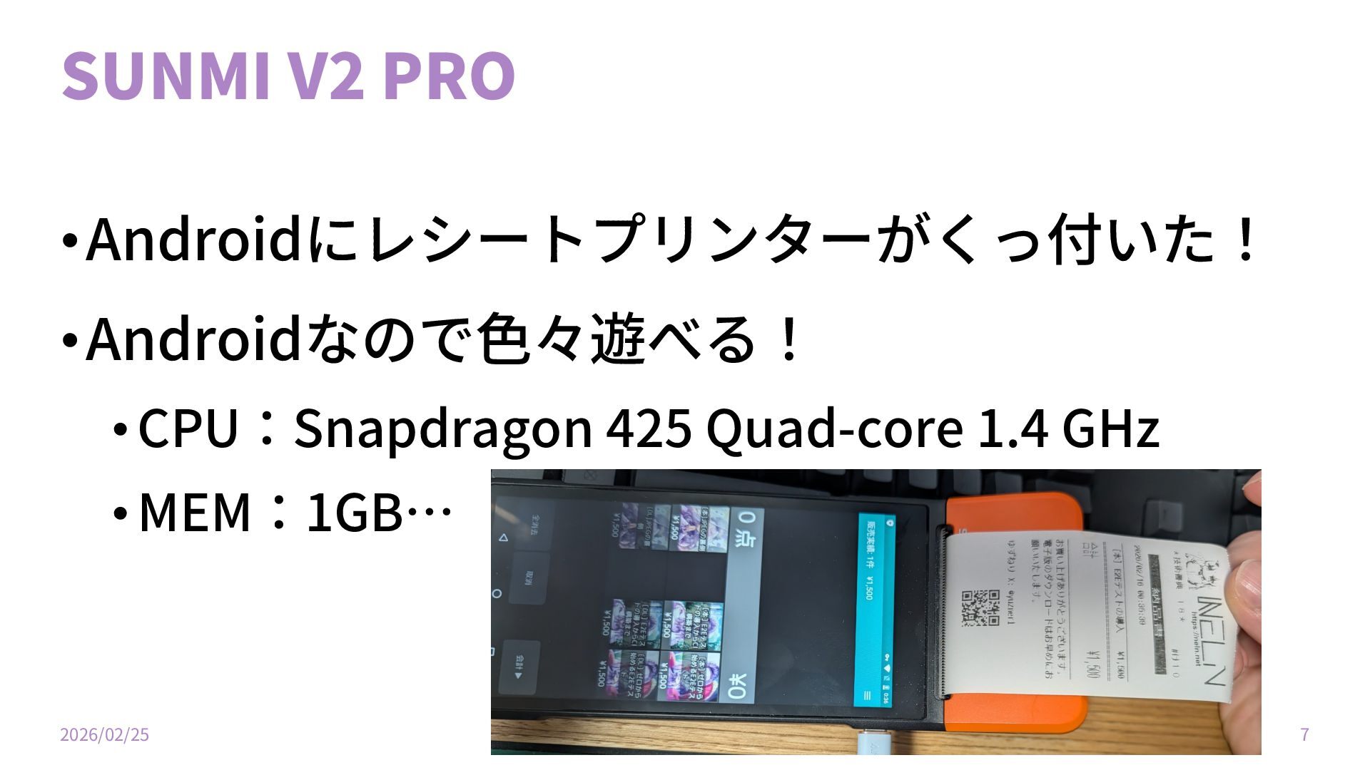 SUNMI V2 PRO •Androidにレシートプリンターがくっ付いた! •Androidなので⾊々遊べる! •CPU:Snapdragon 425 Quad-core 1.4 GHz