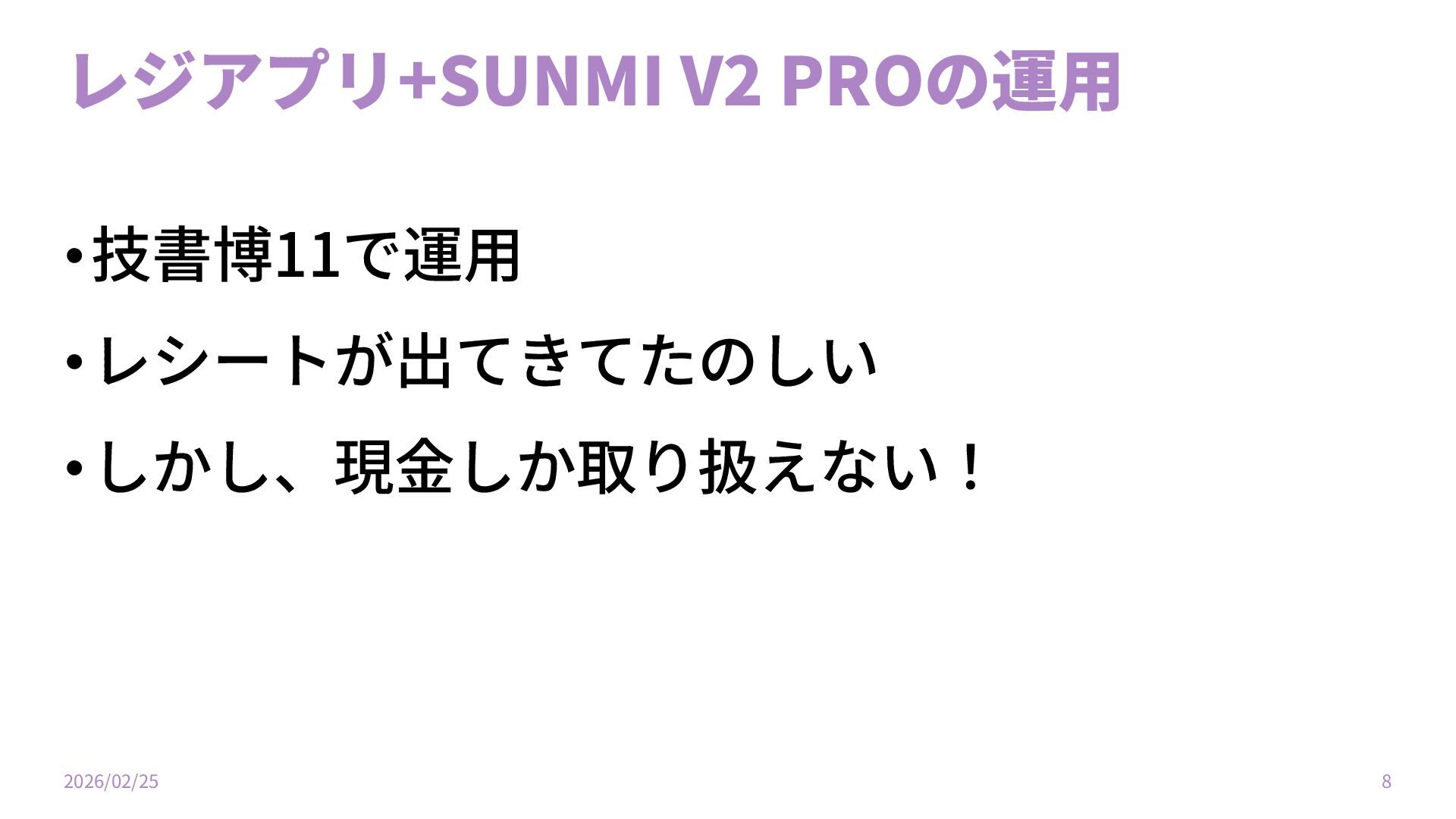 レジアプリ+SUNMI V2 PROの運⽤ •技書博11で運⽤ •レシートが出てきてたのしい •しかし、現⾦しか取り扱えない! 2026/02/25 8