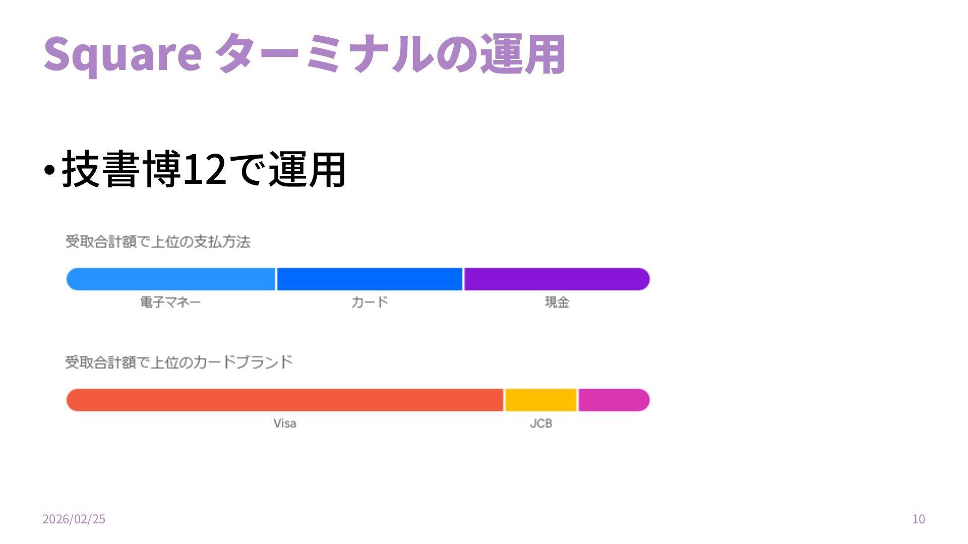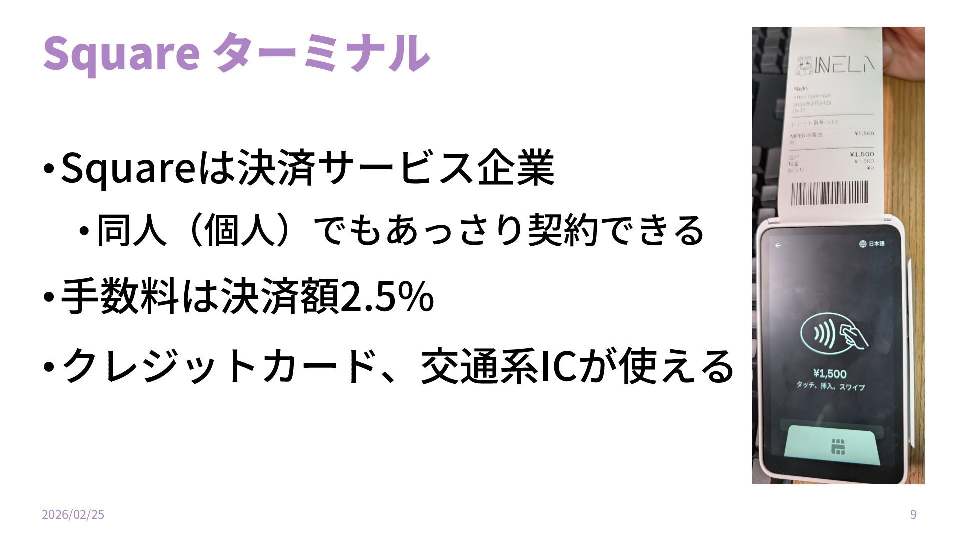 Square ターミナル •Squareは決済サービス企業 •同⼈(個⼈)でもあっさり契約できる •⼿数料は決済額2.5% •クレジットカード、交通系ICが使える 2026/02/25 9