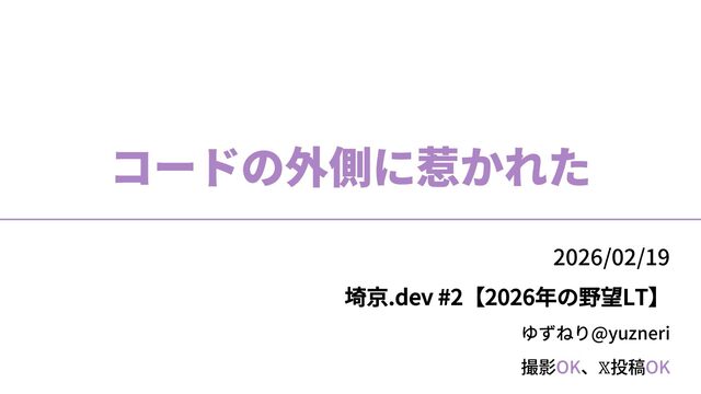 撮影OK、𝕏投稿OK ゆずねり@yuzneri コードの外側に惹かれた 2026/02/19 埼京.dev #2【2026年の野望LT】
